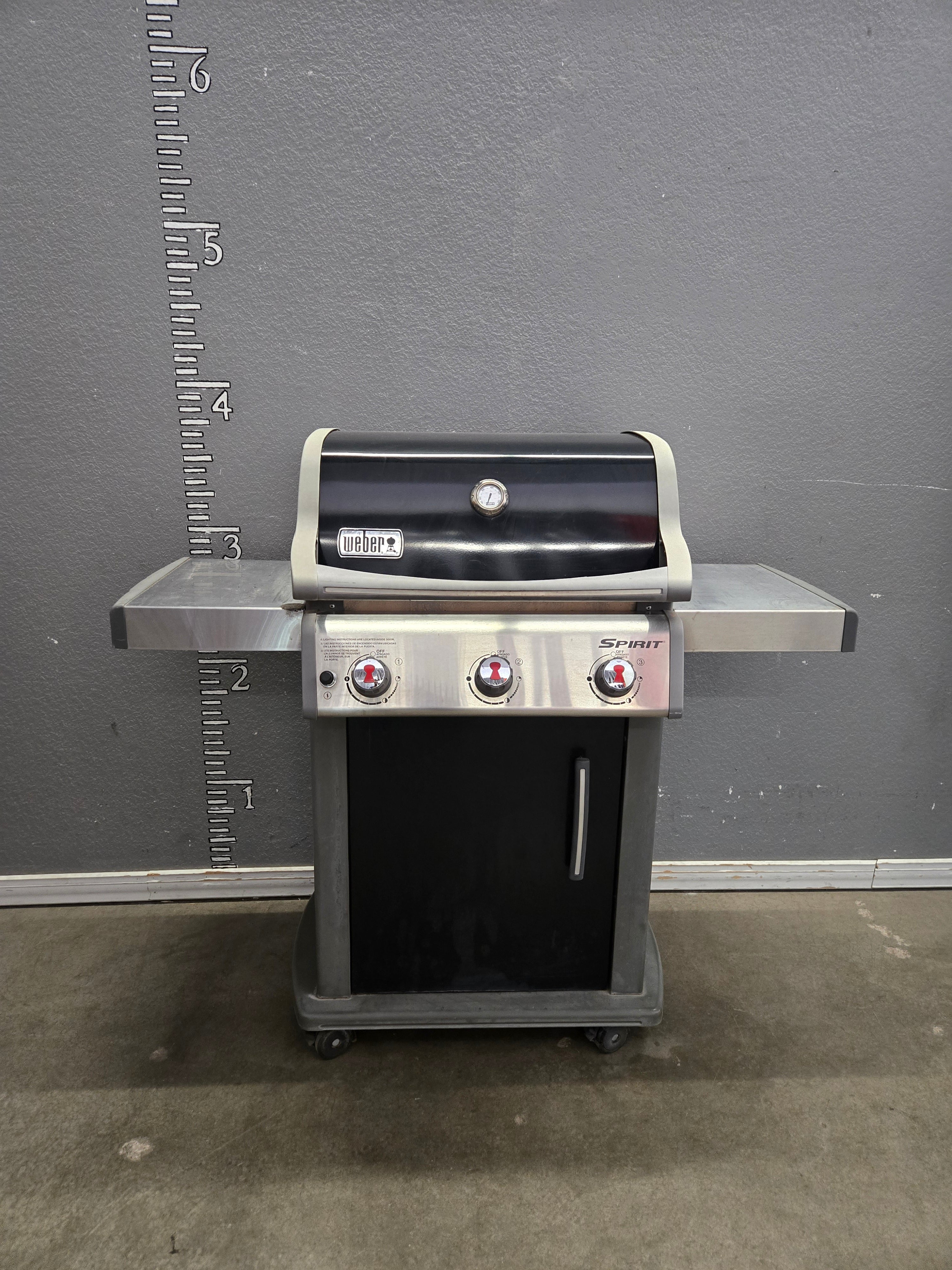This sleek Weber Spirit gas grill features a durable black and stainless steel finish, offering a modern and practical design for outdoor cooking. Approximate Size: 4 x 5 x 2