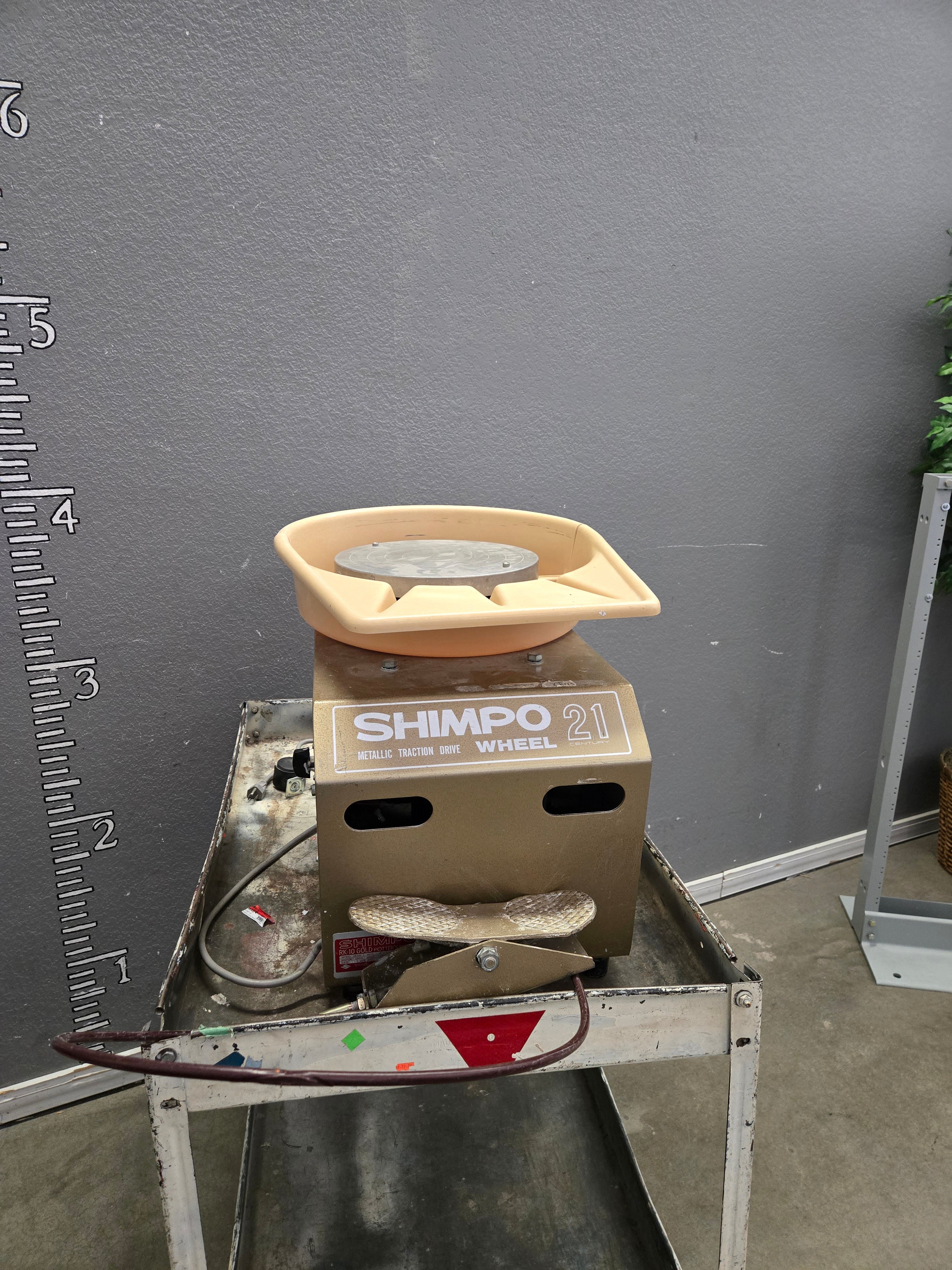 This Shimpo 21 Pottery Wheel features a beige plastic top and a durable metal finish. Ideal for ceramic crafting, it offers a reliable and stable build. Approximate Size: 1.5 x 2 x 2