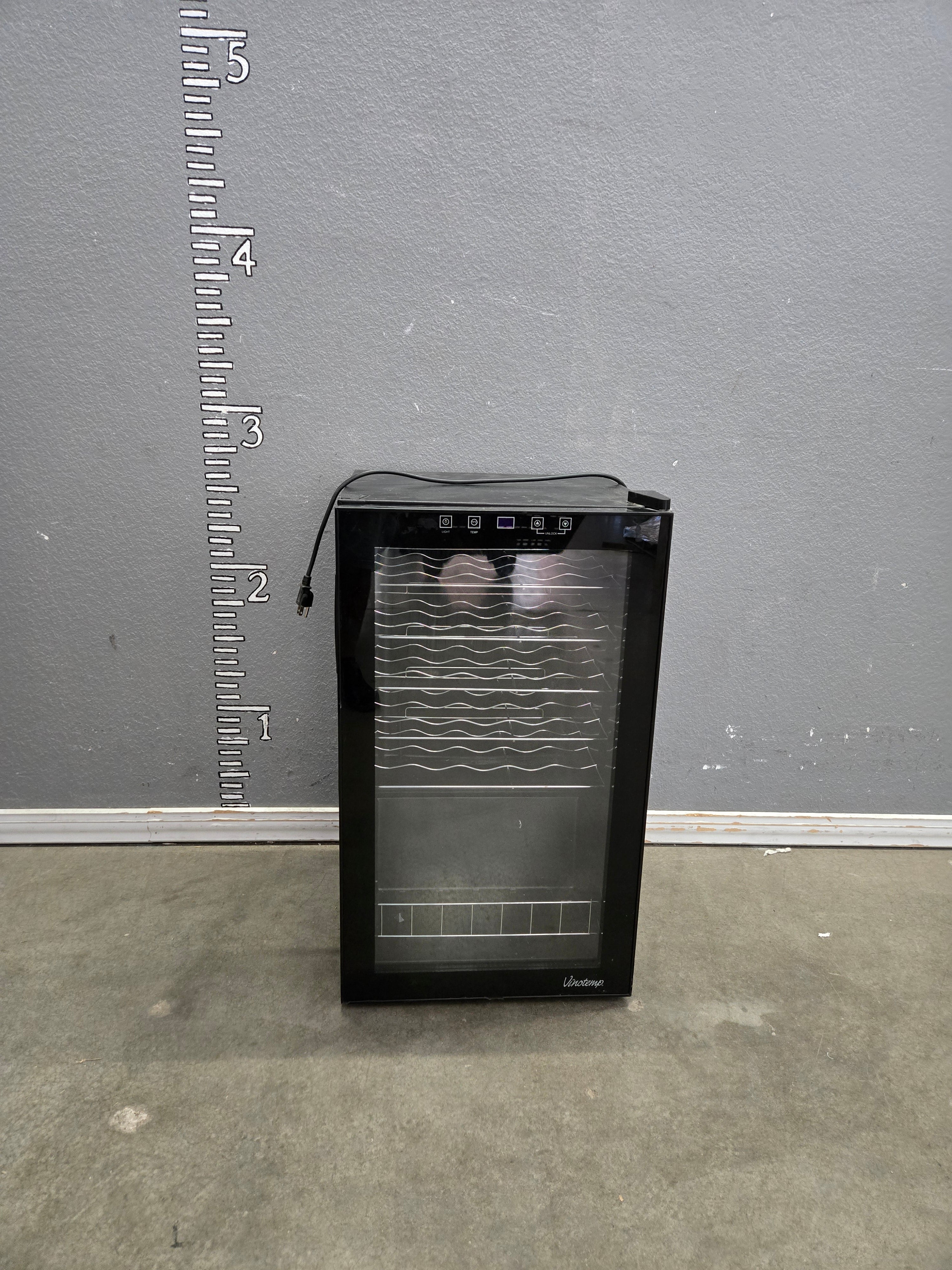 This sleek wine cooler features a smooth black finish with a transparent glass door, offering a stylish way to store and display your wine collection. Approximate Size: 2 x 1.5 x 1.5