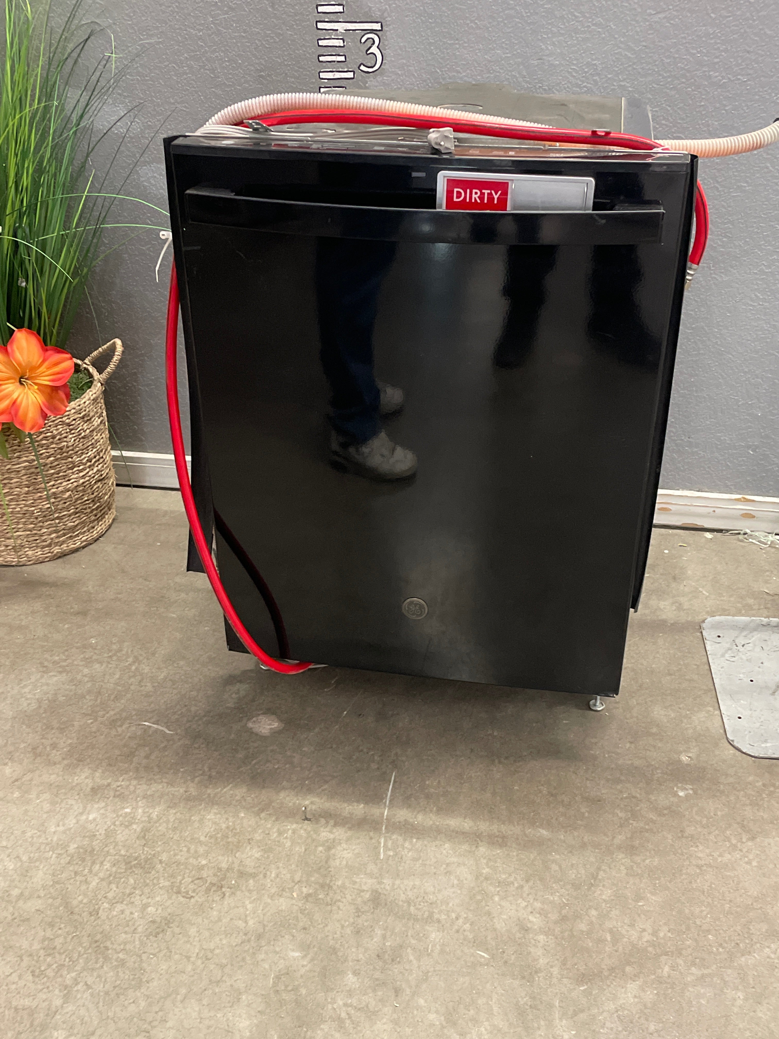 Sleek black portable dishwasher with a glossy finish. Equipped with durable hoses for easy connection. Approximate Size: 3 x 2 x 2