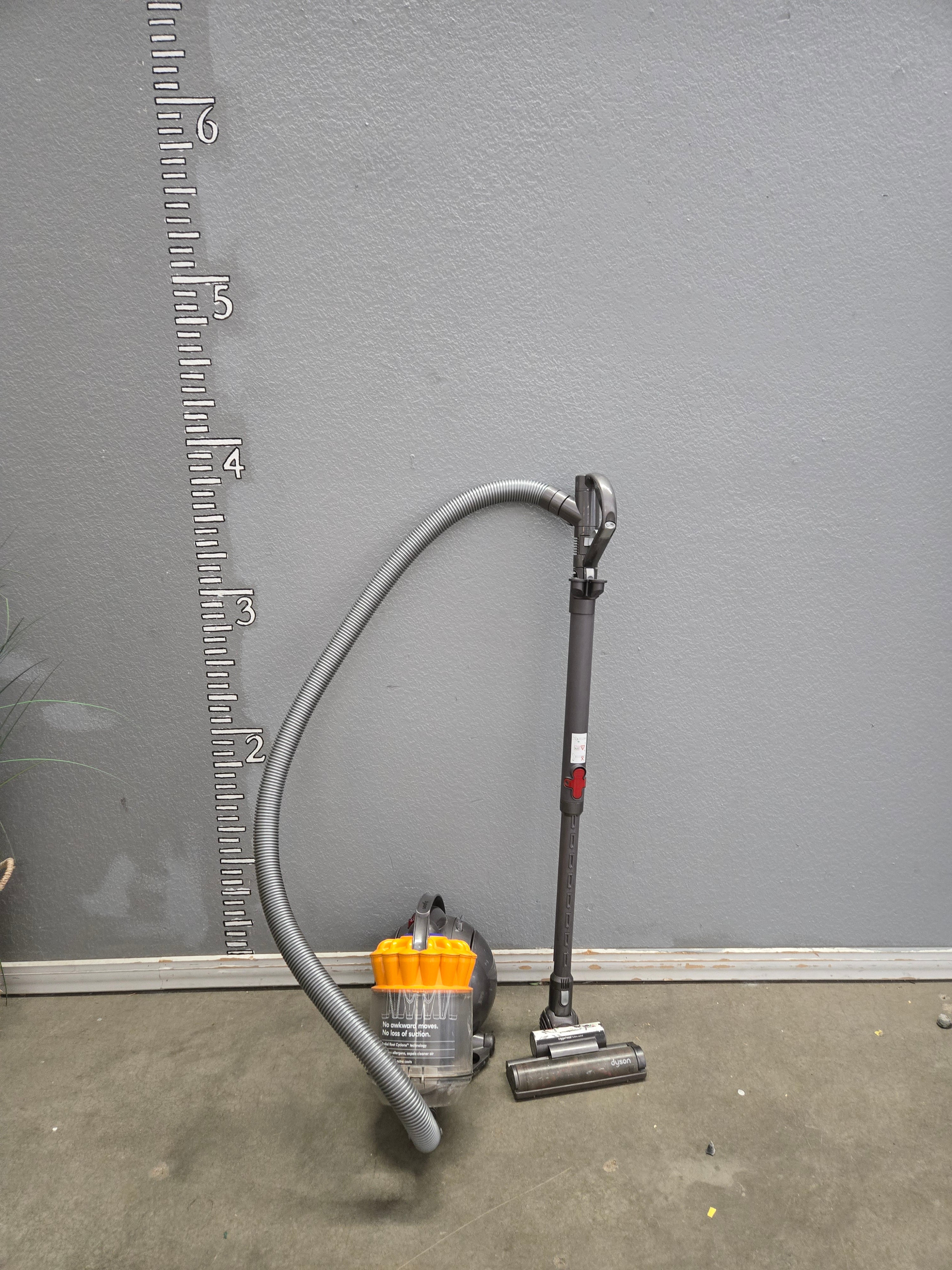 This Dyson vacuum features a sleek gray finish with vibrant yellow accents, designed for optimal performance across various floor types. Approximate Size: 3 x 1.5 x 1.3