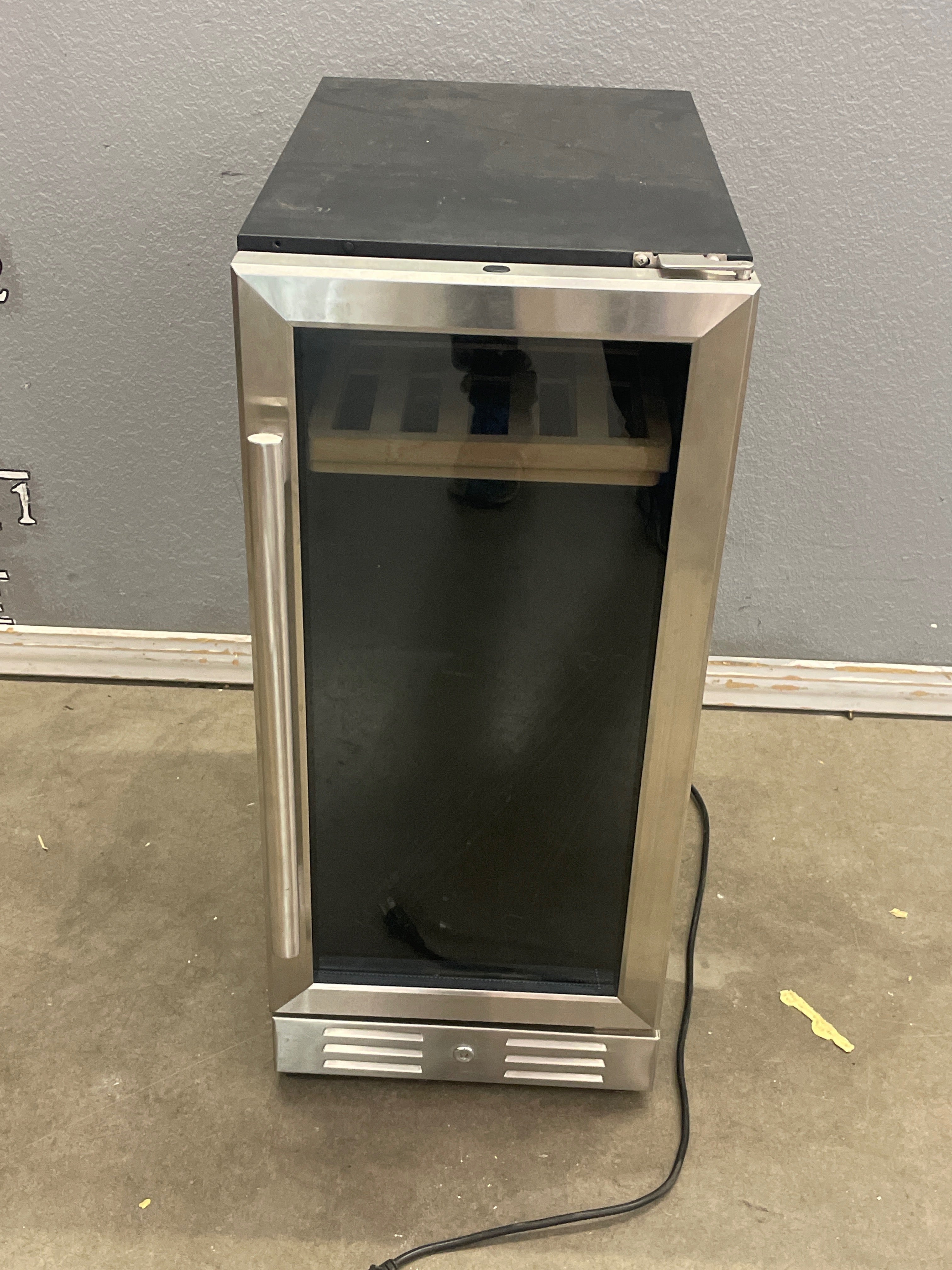 This sleek wine cooler features a modern stainless steel finish with a clear glass door, allowing you to easily view and access your collection. It's perfect for keeping your wines at the ideal temperature. Approximate Size: 3 x 1.5 x 2