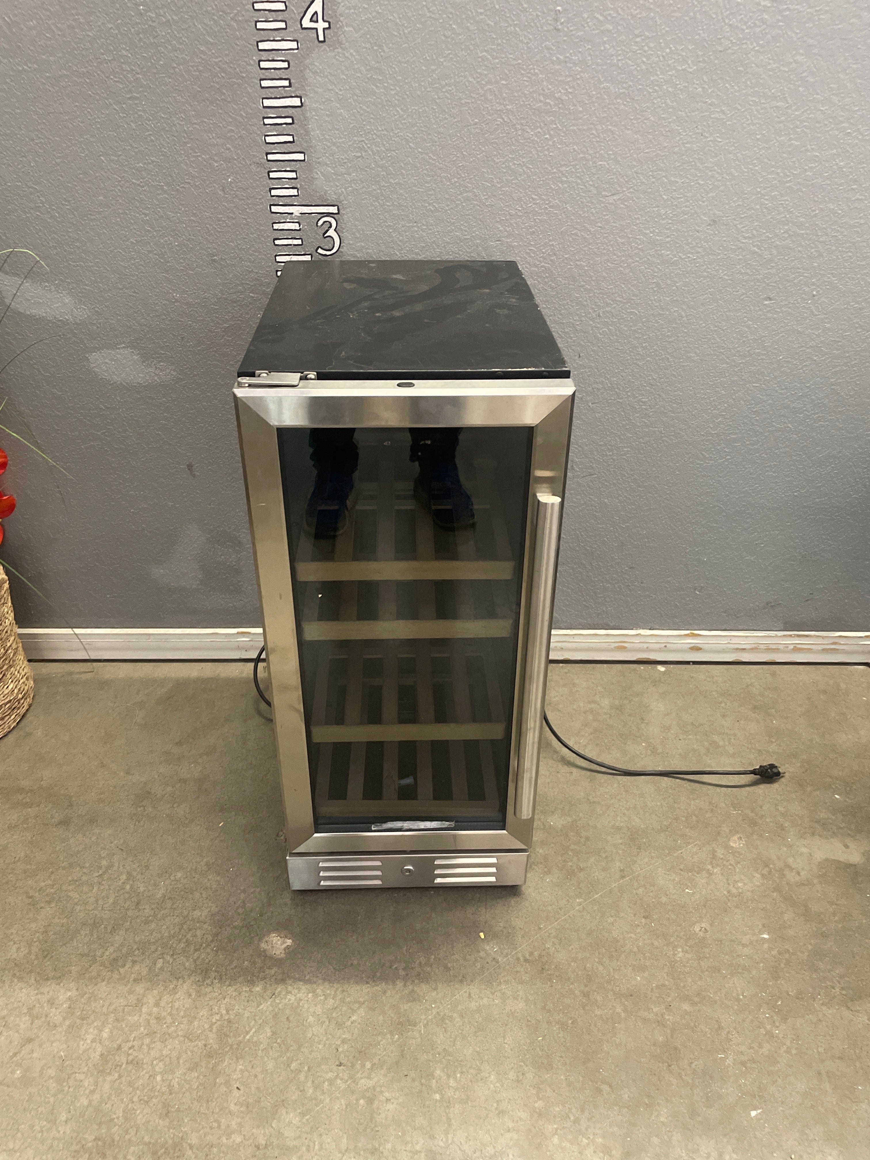 This compact wine cooler features a sleek stainless steel finish with a transparent glass door, allowing easy visibility of your wine collection. It's equipped with wooden shelves for a classic touch and reliable storage. Approximate Size: 3.5 x 1.5 x 1.5