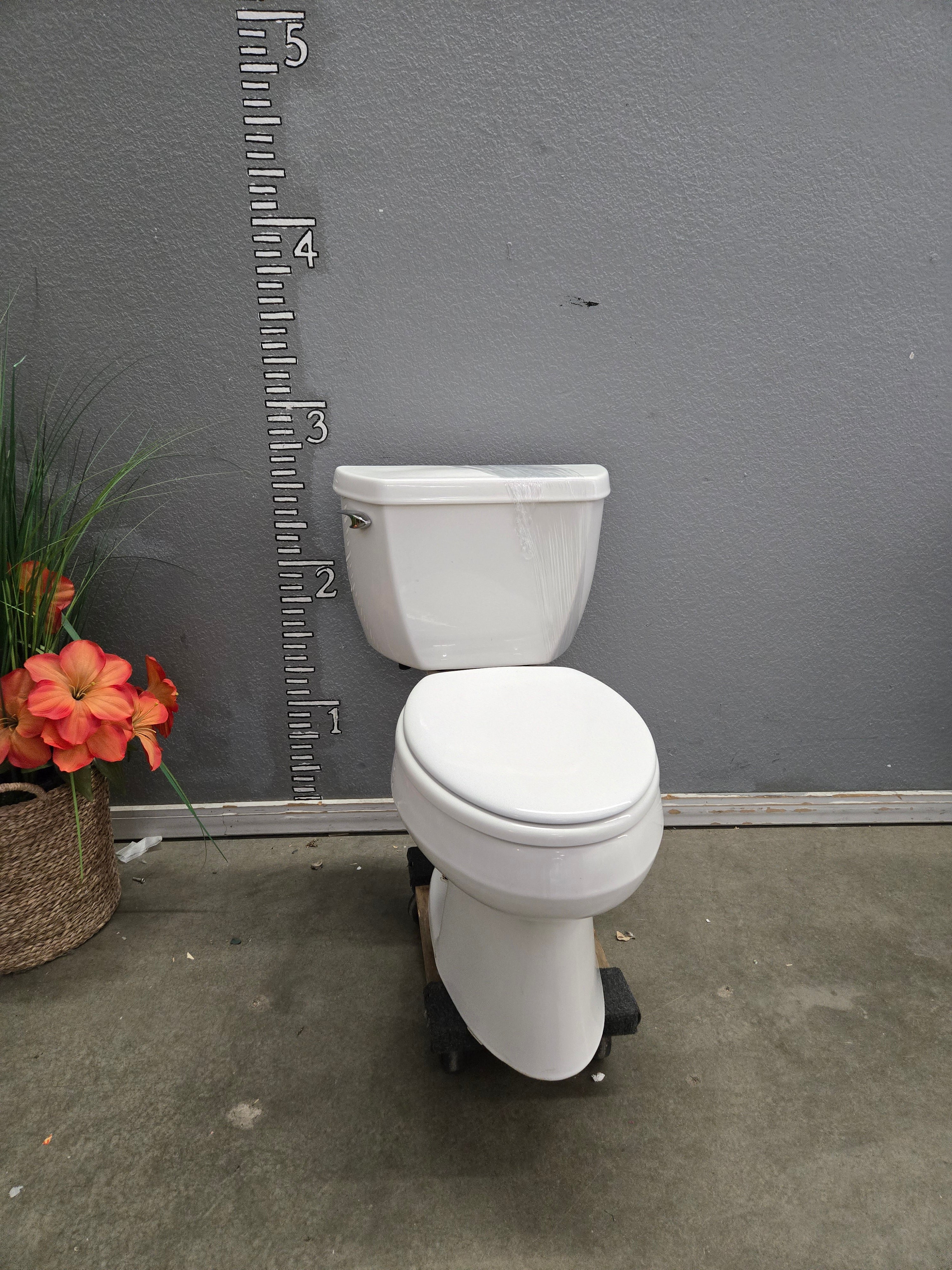 This toilet features a sleek, modern white ceramic finish, offering a clean and contemporary look suitable for any bathroom setting. Approximate Size: 2.5 x 1.5 x 2.25