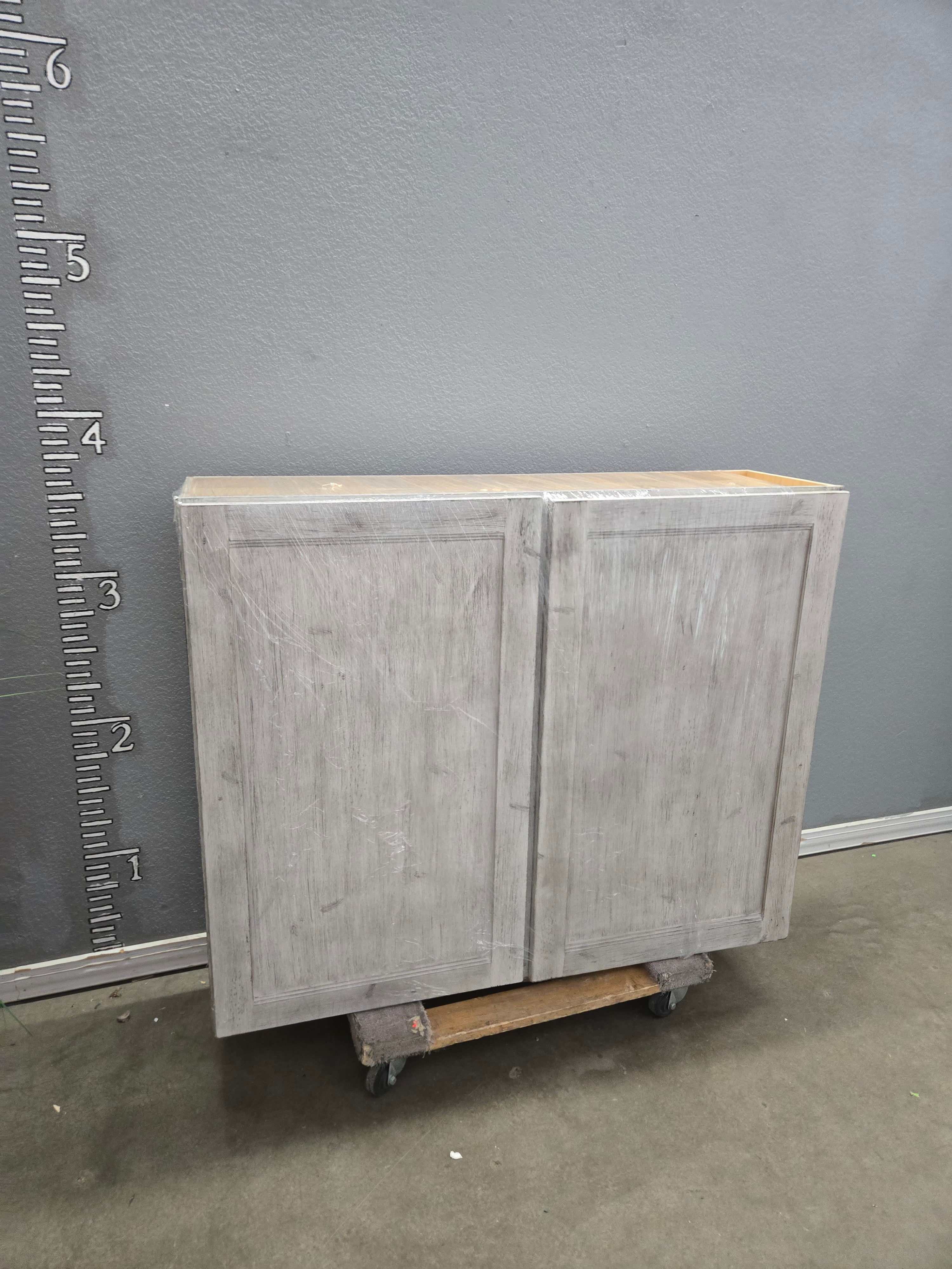 This sturdy, rustic-style wooden cabinet features a weathered gray finish, perfect for adding a touch of vintage charm to any space. Its simple, two-door design offers ample storage. Approximate Size: 3 x 3.5 x 1