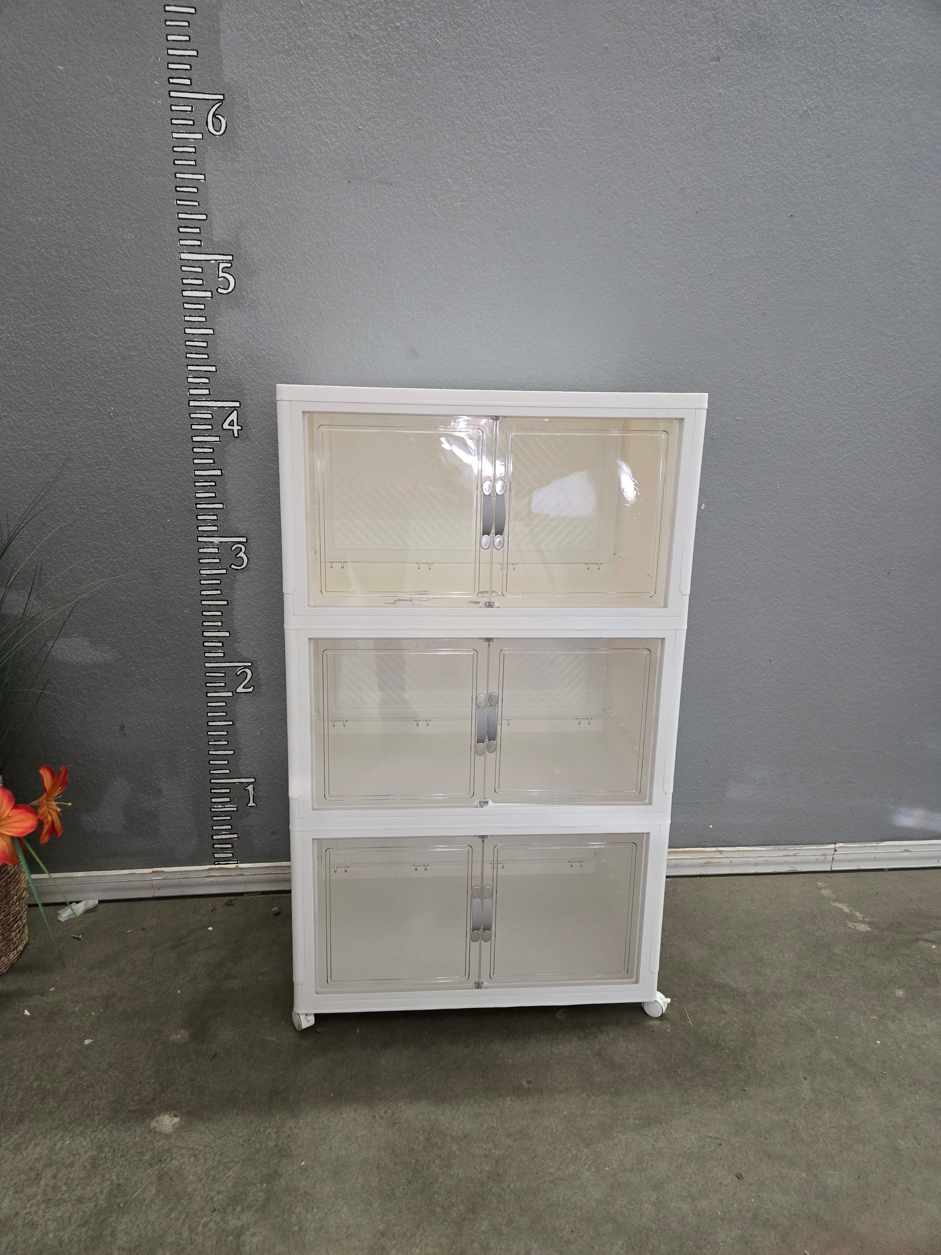 This compact storage cabinet features a sleek white finish with transparent doors, perfect for organizing any room. The lightweight plastic construction ensures durability and ease of movement. Approximate Size: 4 x 2.5 x 1.5