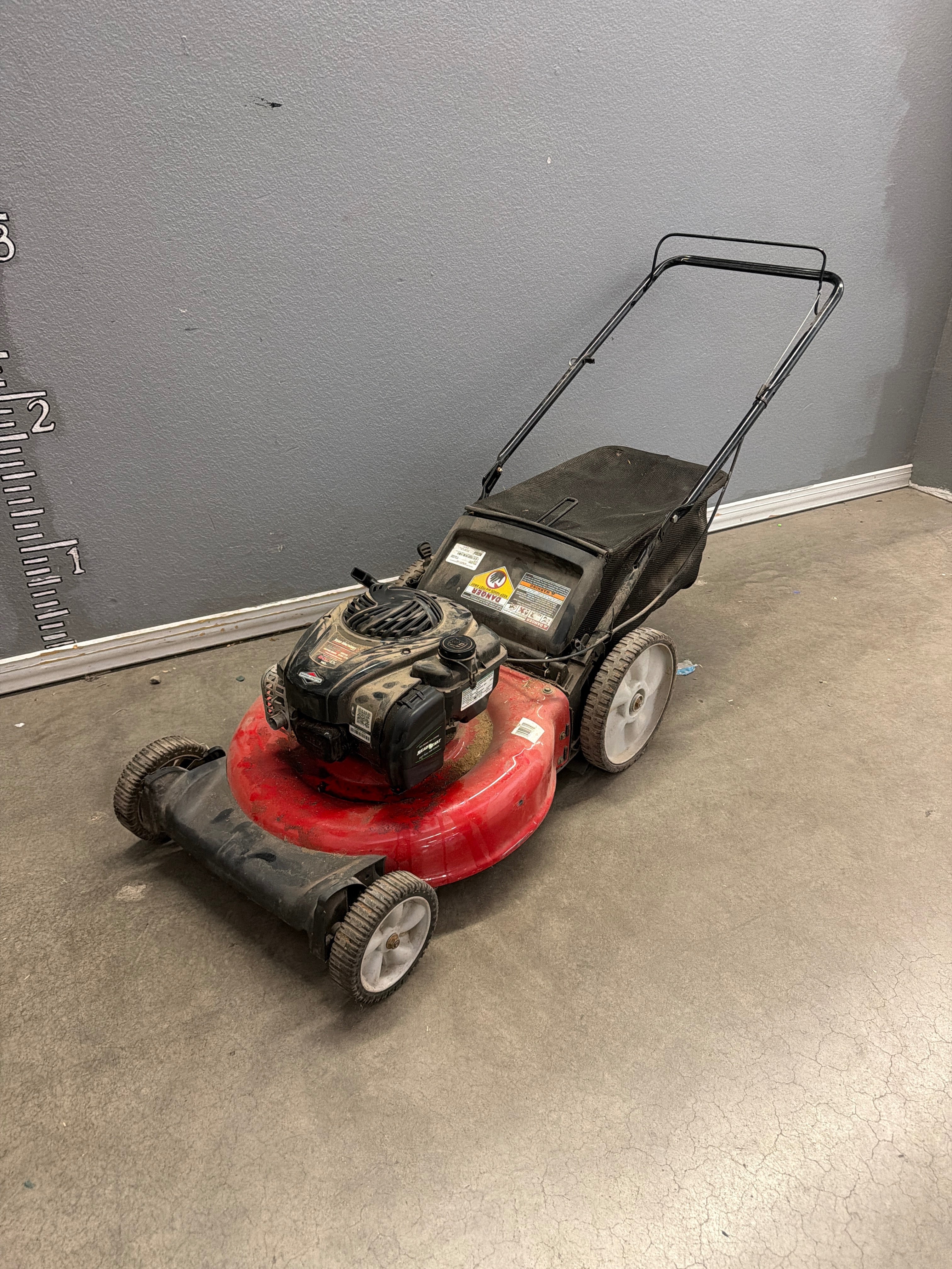 A robust gas-powered lawn mower featuring a red metal finish with black accents. Ideal for maintaining your lawn with ease. *needs gas & oil. engine has good compression.* Approximate Size: 3 x 2 x 4