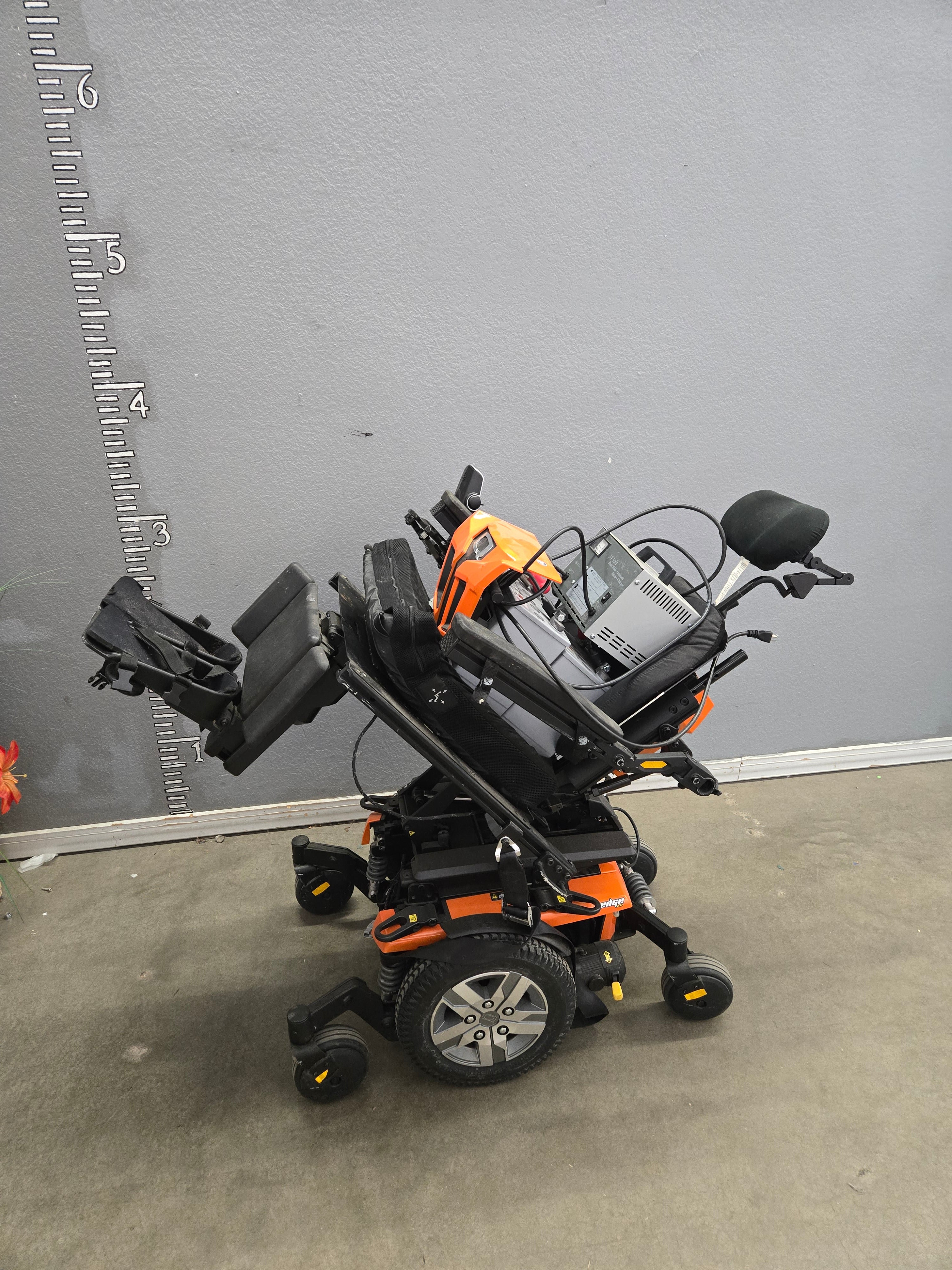 This electric wheelchair features a vibrant orange finish with adjustable seating for comfortable use. It is designed for maneuverability and convenience. Approximate Size: 3.5 x 2.5 x 3