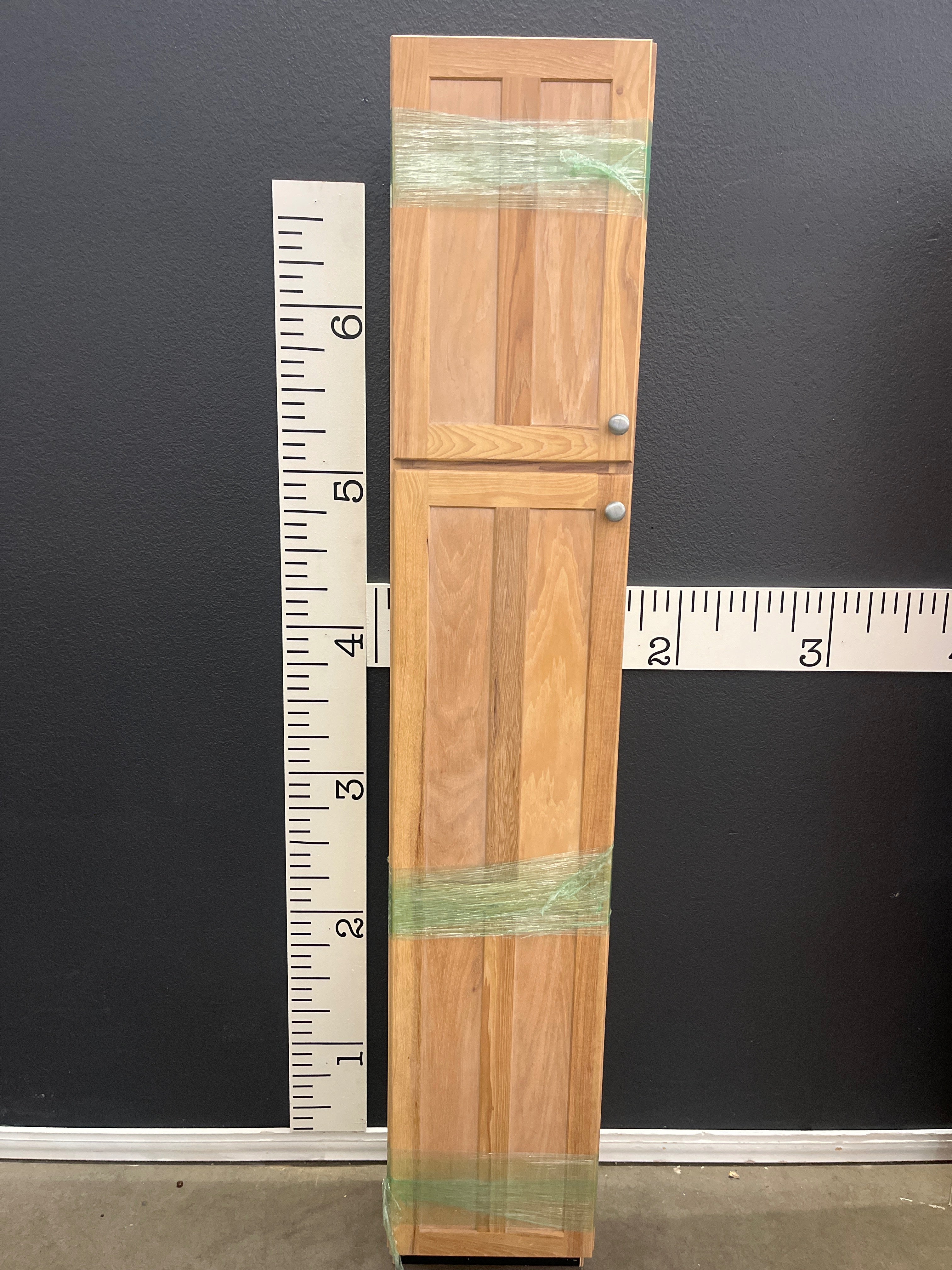This tall storage cabinet features a natural wood finish with a smooth texture. It has two doors with sleek metallic knobs, offering a classic look that fits well in various room settings. Approximate Size: 6 x 1 x 0.5