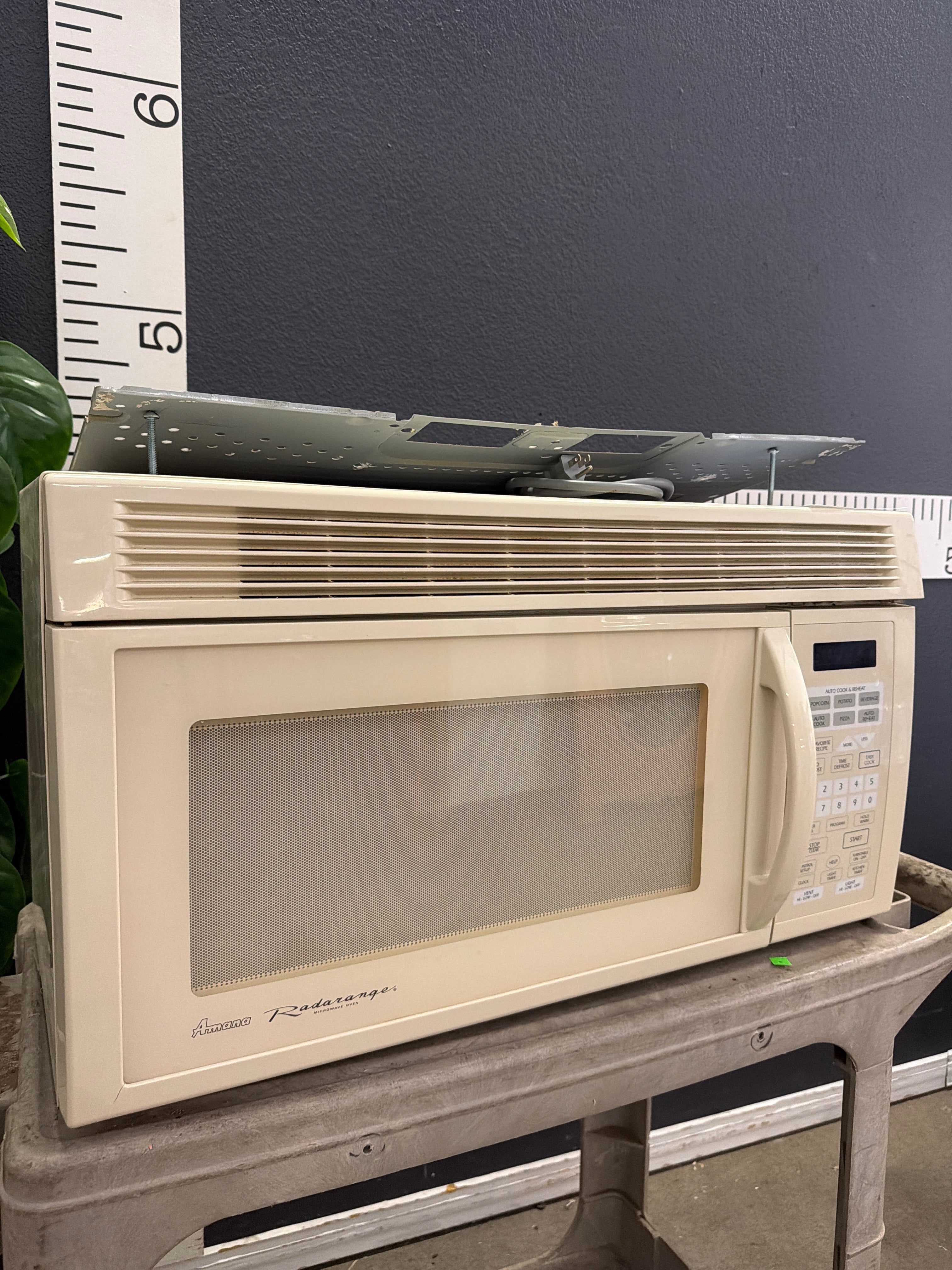This beige Amana Radarange microwave features a classic, smooth finish. It's designed to be mounted above the range, providing efficient kitchen use. Approximate Size: 1.5 x 2 x 1.5