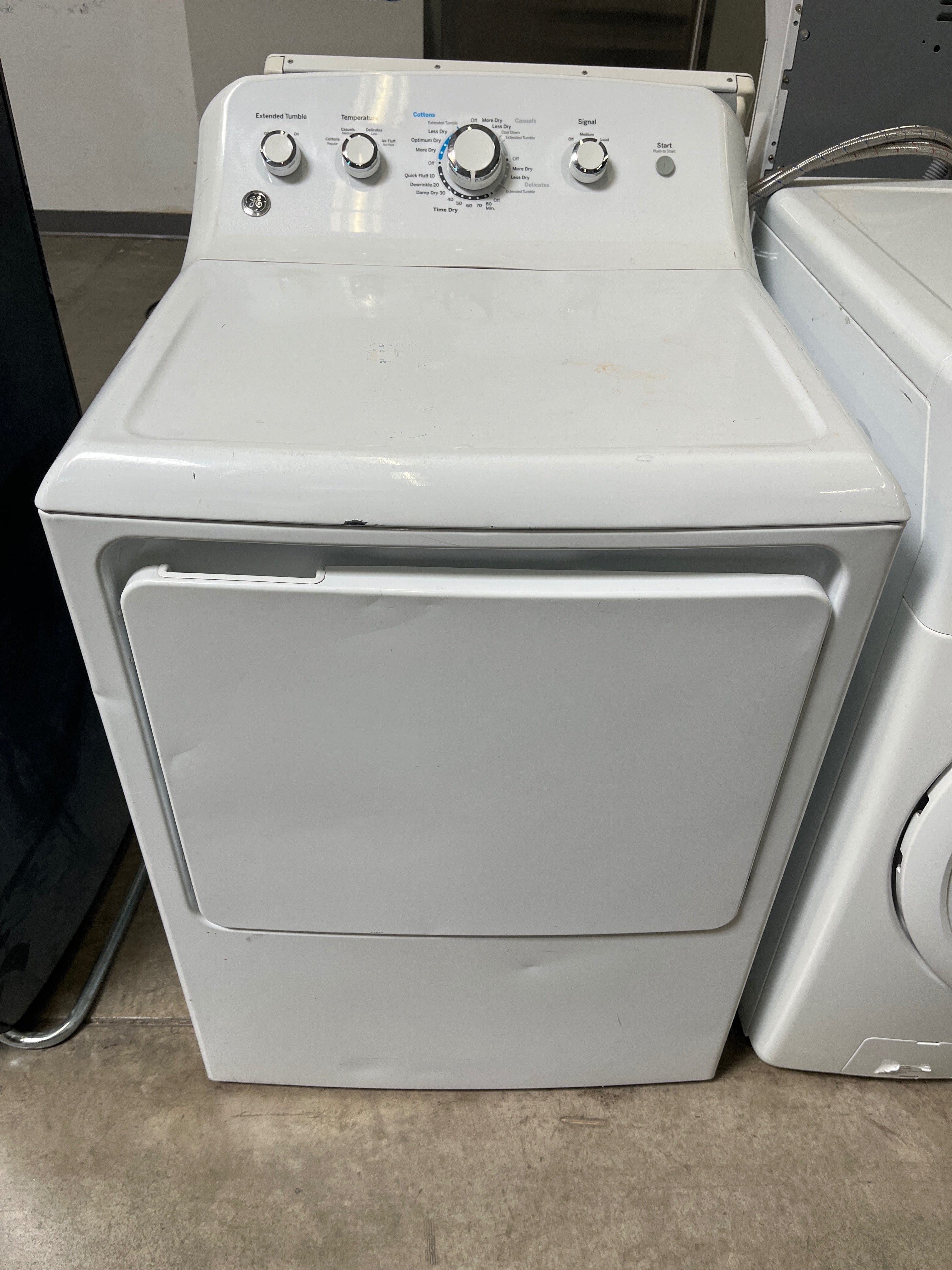 This white GE electric dryer features a sleek, smooth finish with multiple adjustable settings for optimal drying results. Approximate Size: 3.5 x 2.5 x 2.5