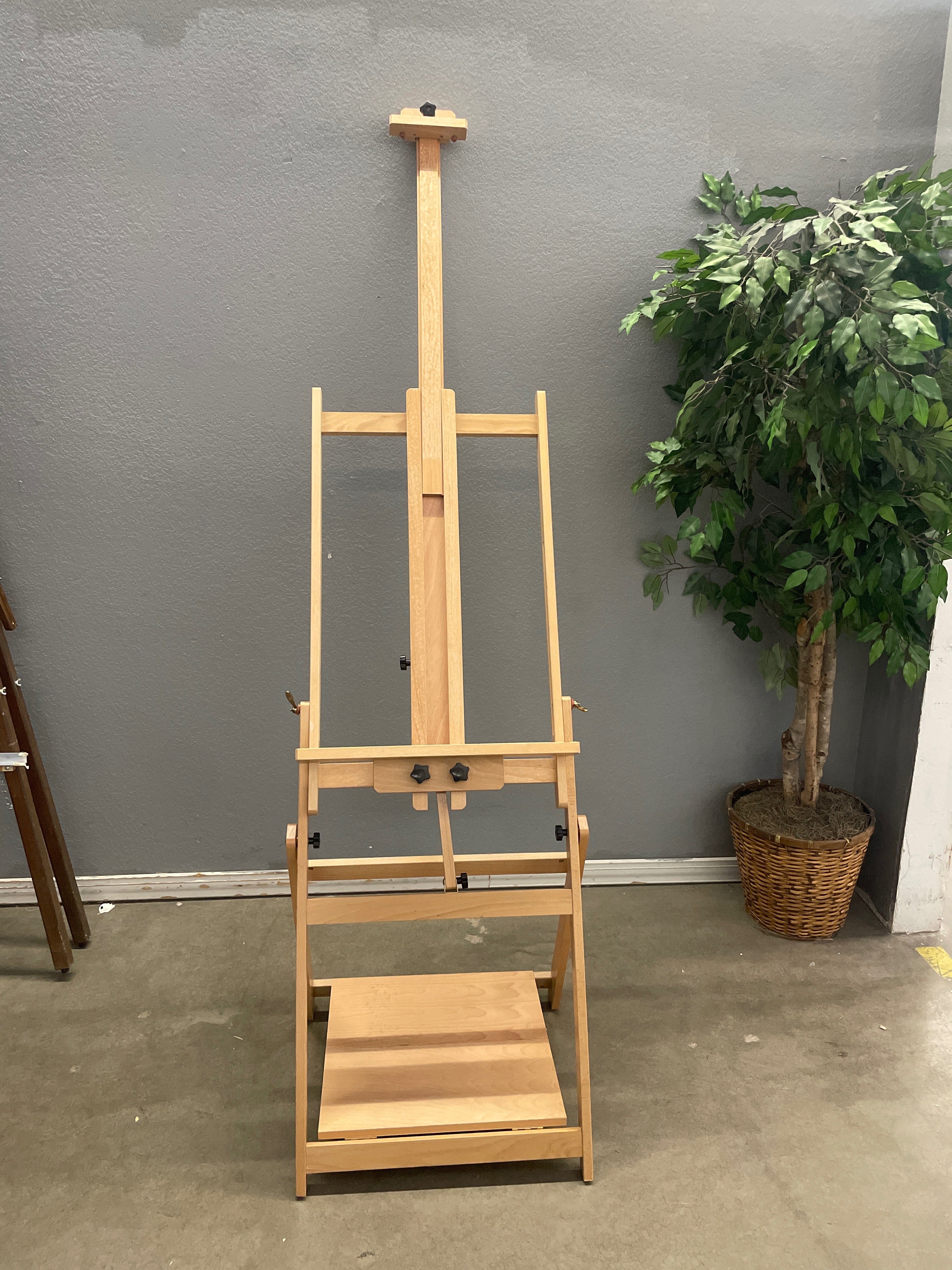 This adjustable wooden art easel features a natural wood finish, ideal for holding canvases and boards. Its sturdy construction provides stability for artists working on various art projects. Approximate Size: 6 x 2 x 2