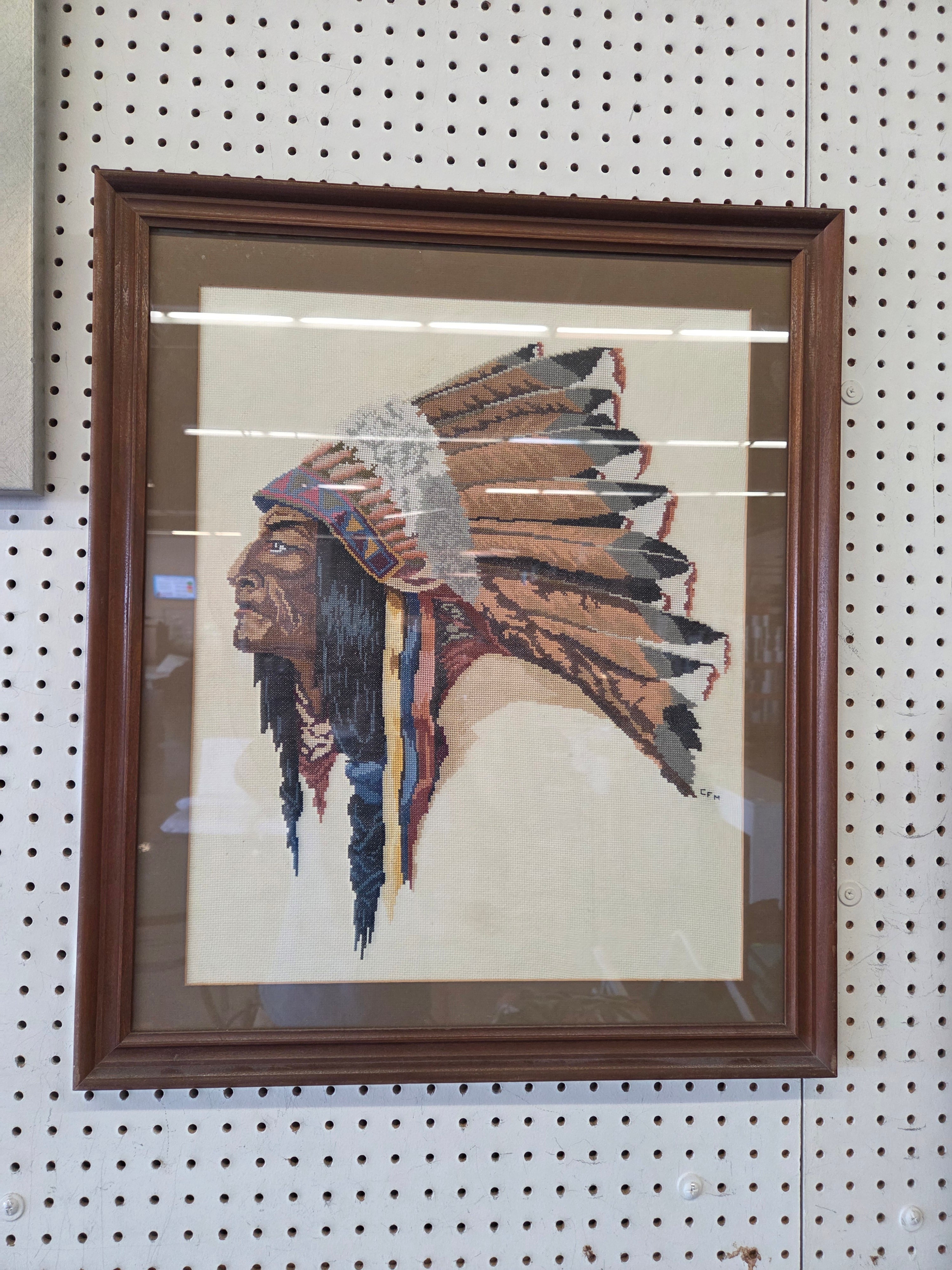 This framed art piece features a cross-stitched depiction of a Native American chief in a detailed headdress. The wood frame has a dark brown finish, complementing the earthy tones of the fabric art. Approximate Size: 2 x 1.5 x 0.1