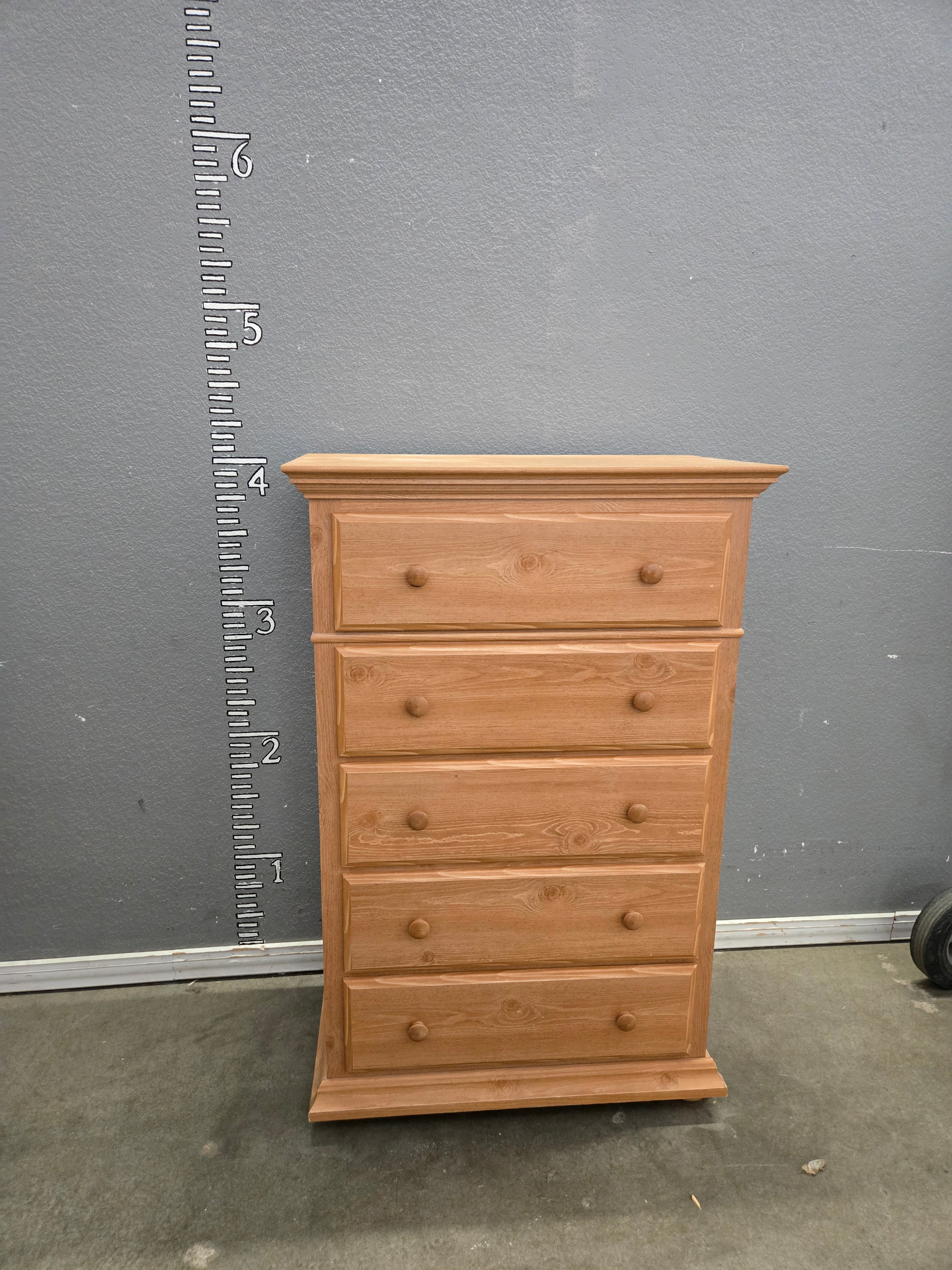 This elegant chest features a natural wood finish with a smooth surface, offering ample storage with its five drawers. Perfect for organizing clothes or accessories in your home. Approximate Size: 4.5 x 2.5 x 1.5