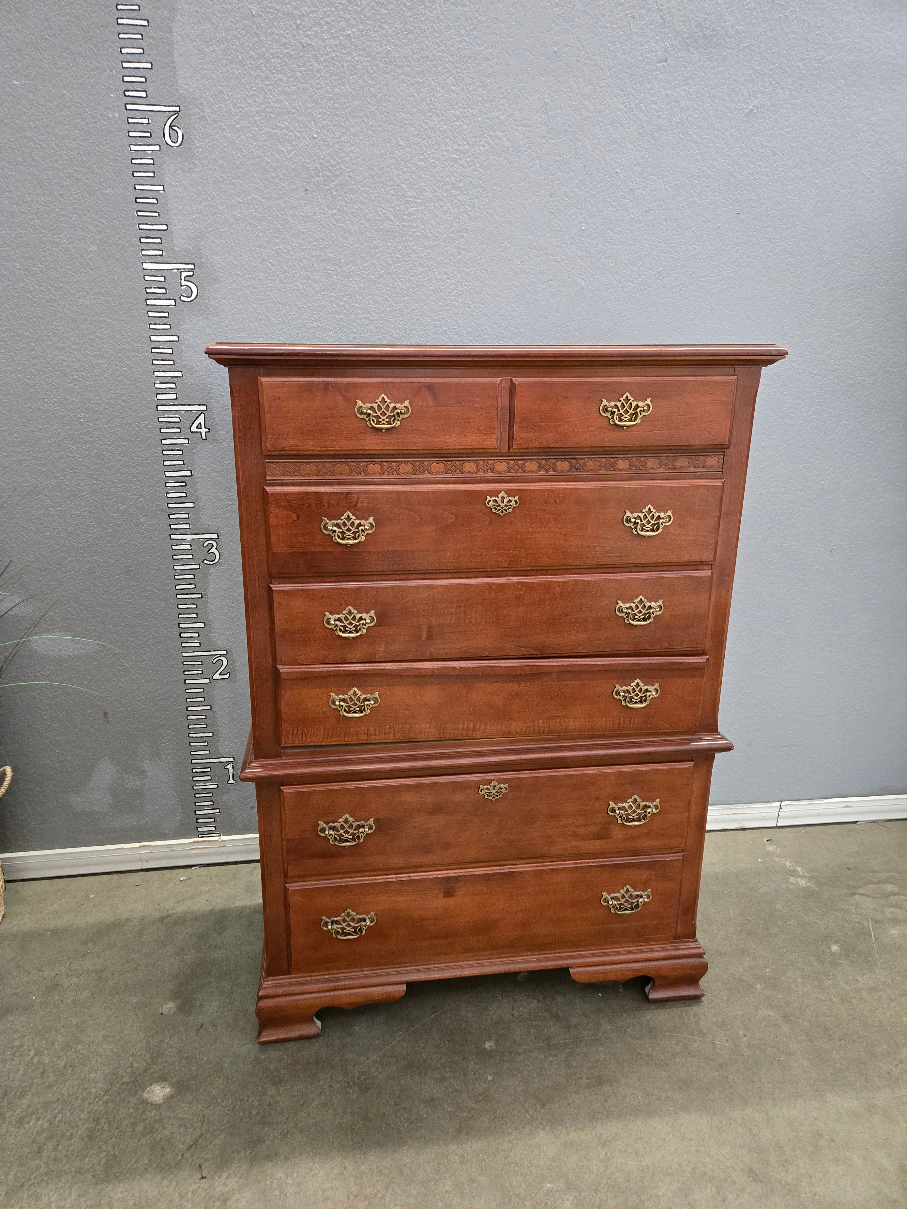 This elegant vintage chest of drawers features a rich mahogany finish and intricate brass hardware. The sturdy construction and timeless design make it a perfect addition to any traditional or contemporary space. Approximate Size: 4.5 x 3 x 1.5