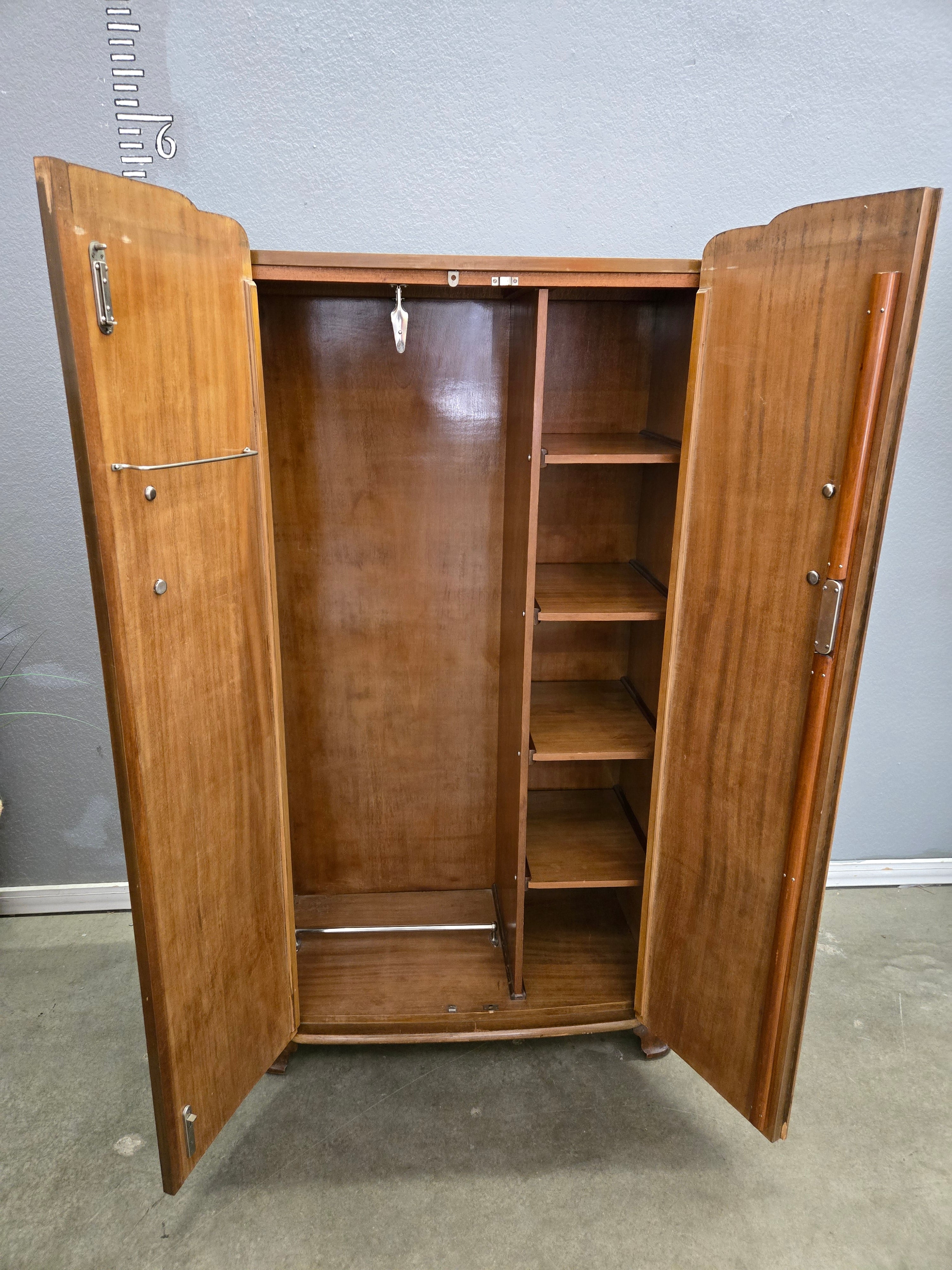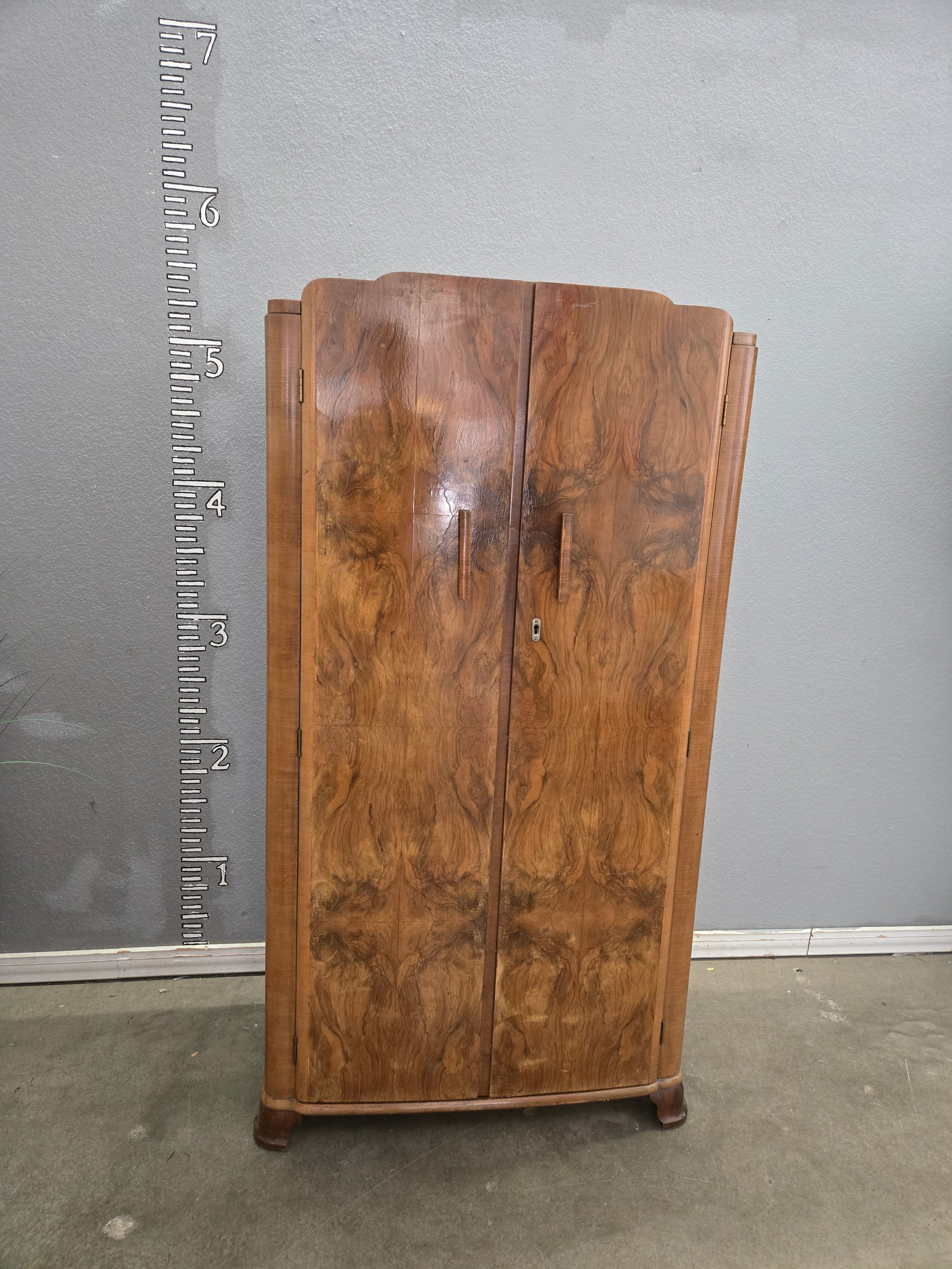 This vintage wardrobe features a beautiful walnut veneer with a high-gloss finish, showcasing the distinctive grain patterns characteristic of Art Deco styling. The piece offers ample storage with its spacious interior, making it a practical and stylish addition to any home. Approximate Size: 6 x 3 x 1.5