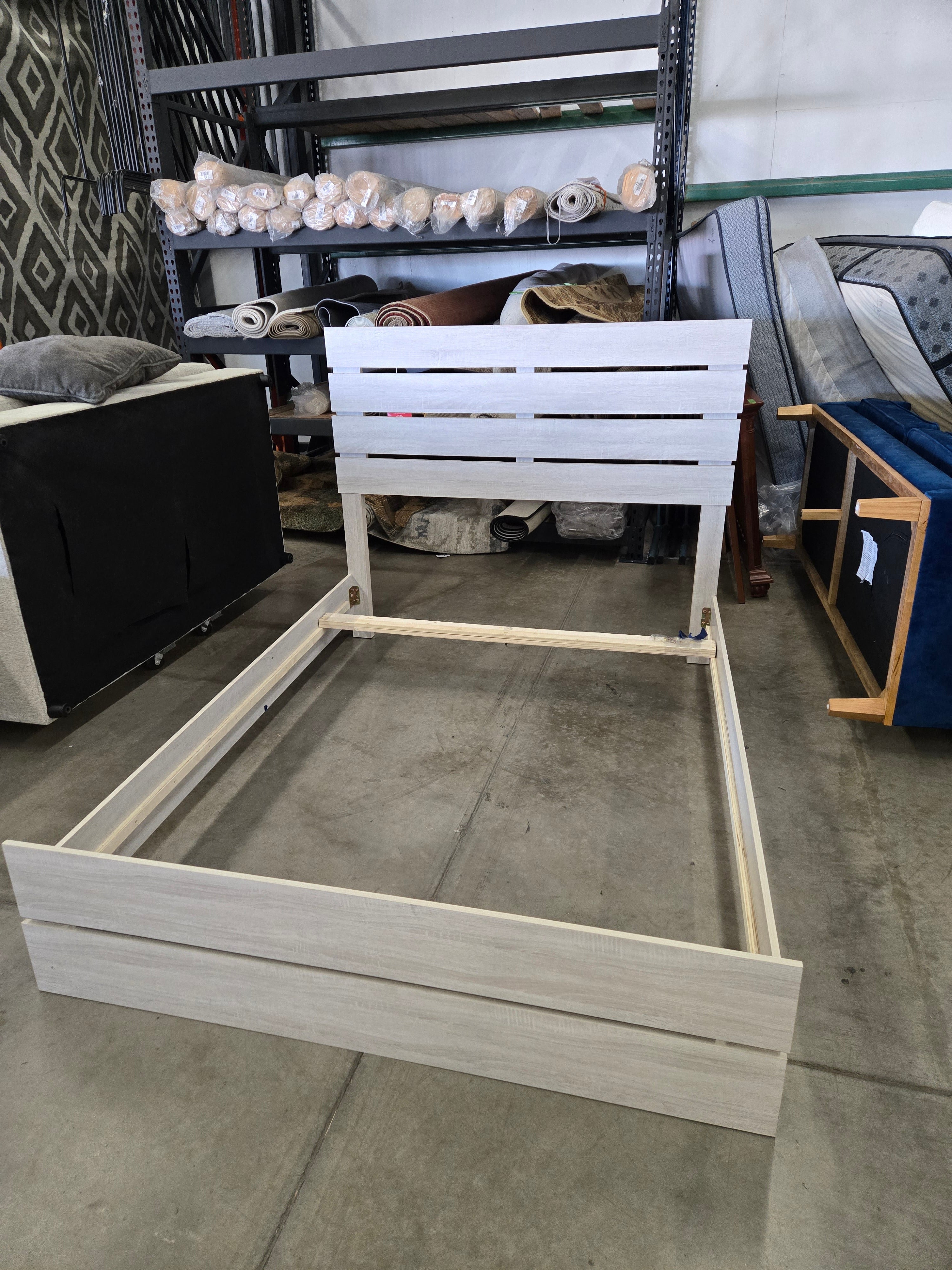 This sleek and modern bed frame features a light wood finish with a slatted headboard design. The contemporary style blends effortlessly into any bedroom decor, offering both elegance and simplicity. Approximate Size: 3 x 5 x 6