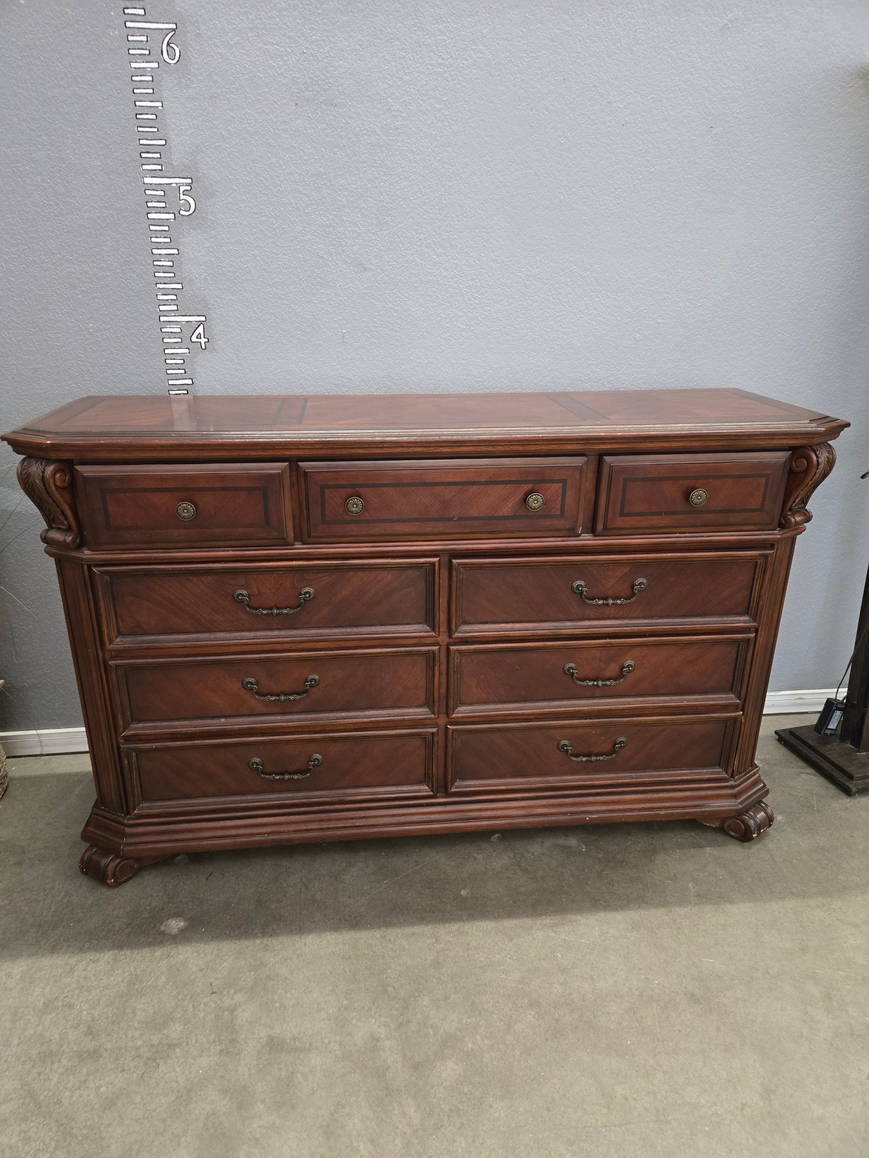 This classic dresser features a rich dark brown wood finish and a smooth, polished surface. With an elegant design and ornate handles, it is both functional and stylish. Approximate Size: 3 x 5 x 1.5