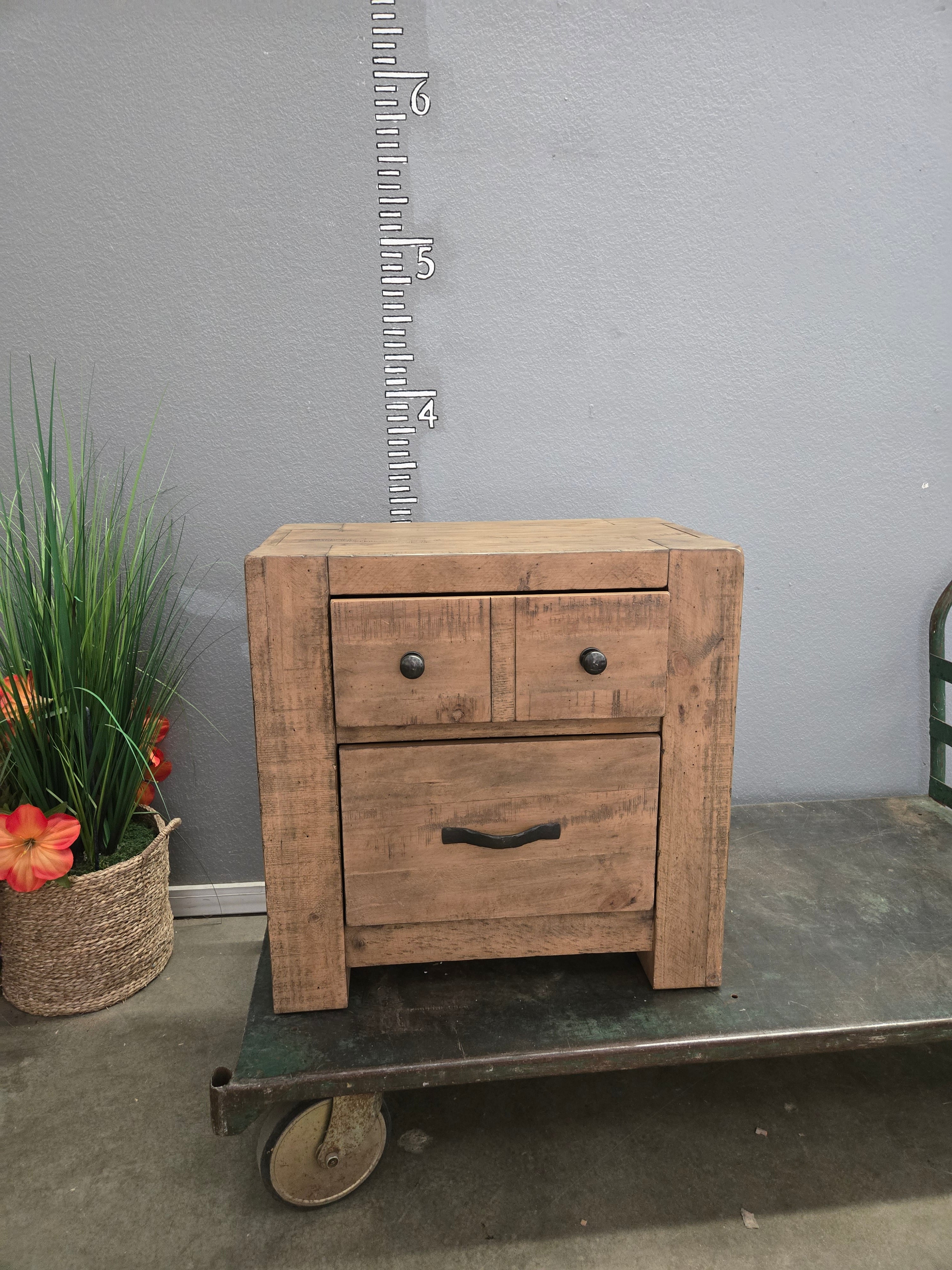 A charming rustic nightstand crafted from natural wood with a distressed finish, complete with two top drawers and a larger bottom drawer, perfect for adding a touch of vintage appeal to your bedroom decor. Approximate Size: 2.5 x 1.5 x 1.5