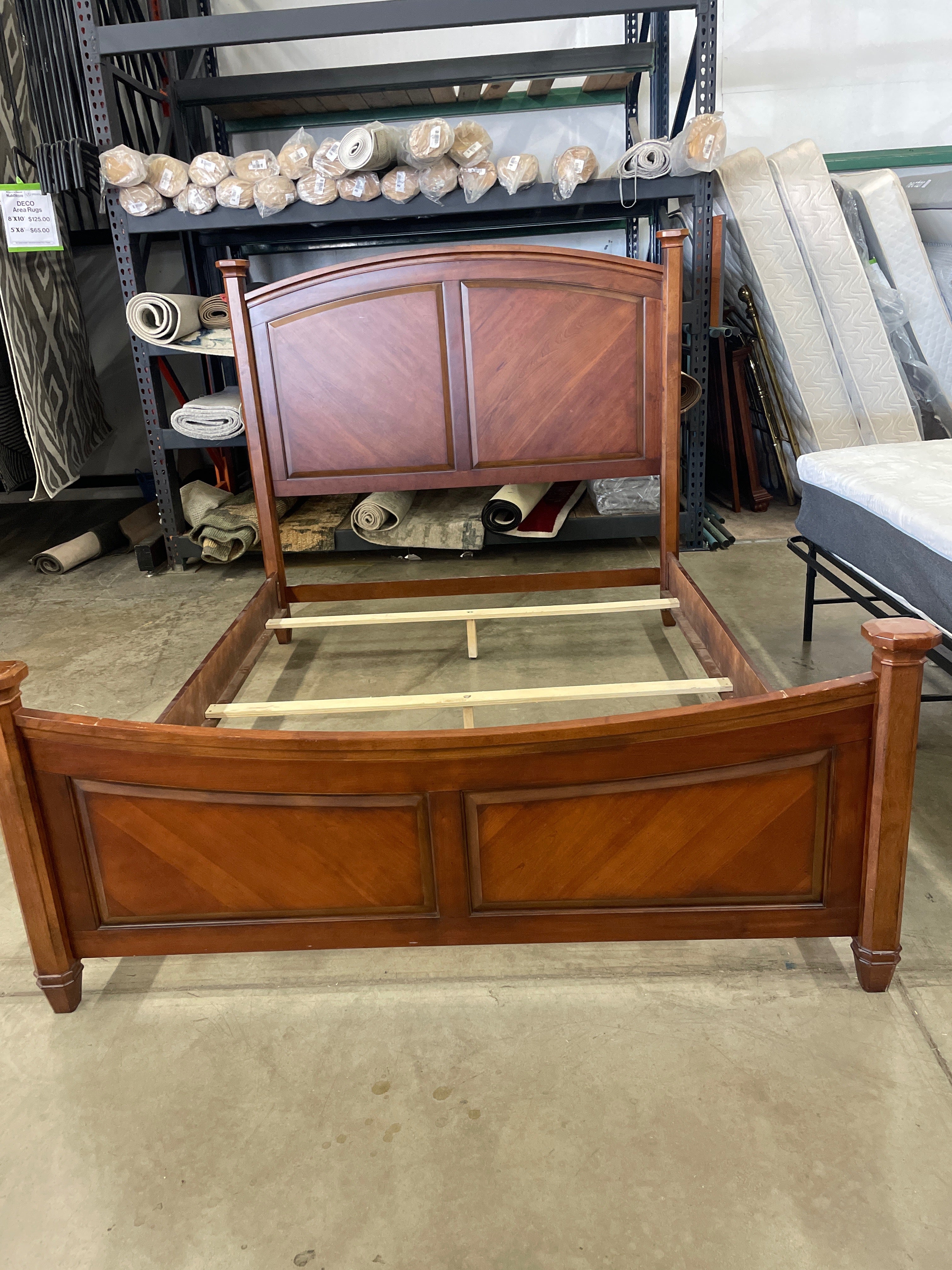 This elegant bed frame features a warm brown finish with a smooth, polished surface. The sturdy wooden construction complements its traditional design. Approximate Size: 4 x 5 x 7