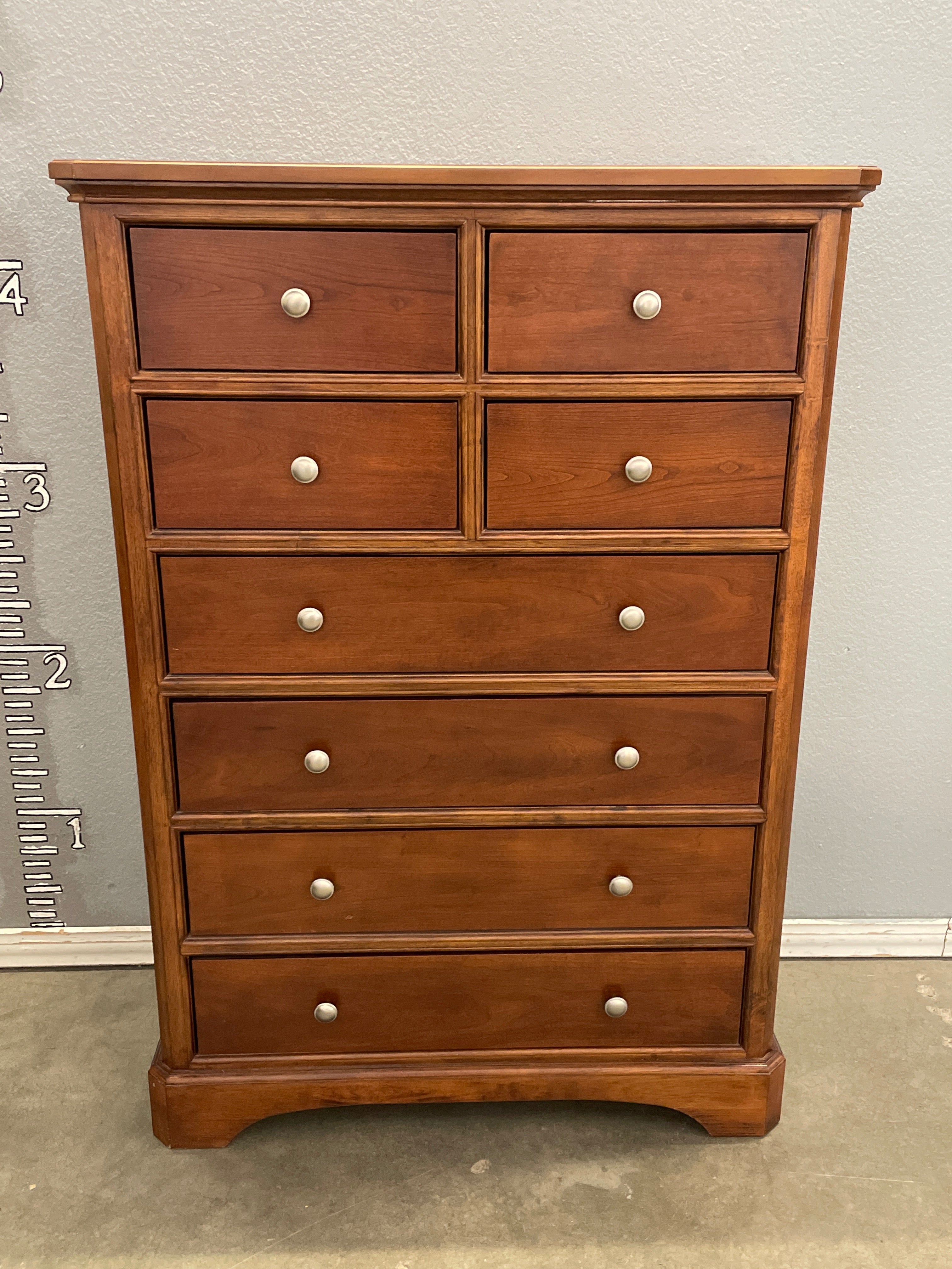 A beautifully crafted chest of drawers in a warm brown finish with smooth wooden surfaces and silver knobs. Perfect for adding timeless elegance and storage to your home. Approximate Size: 4 x 3 x 1.5