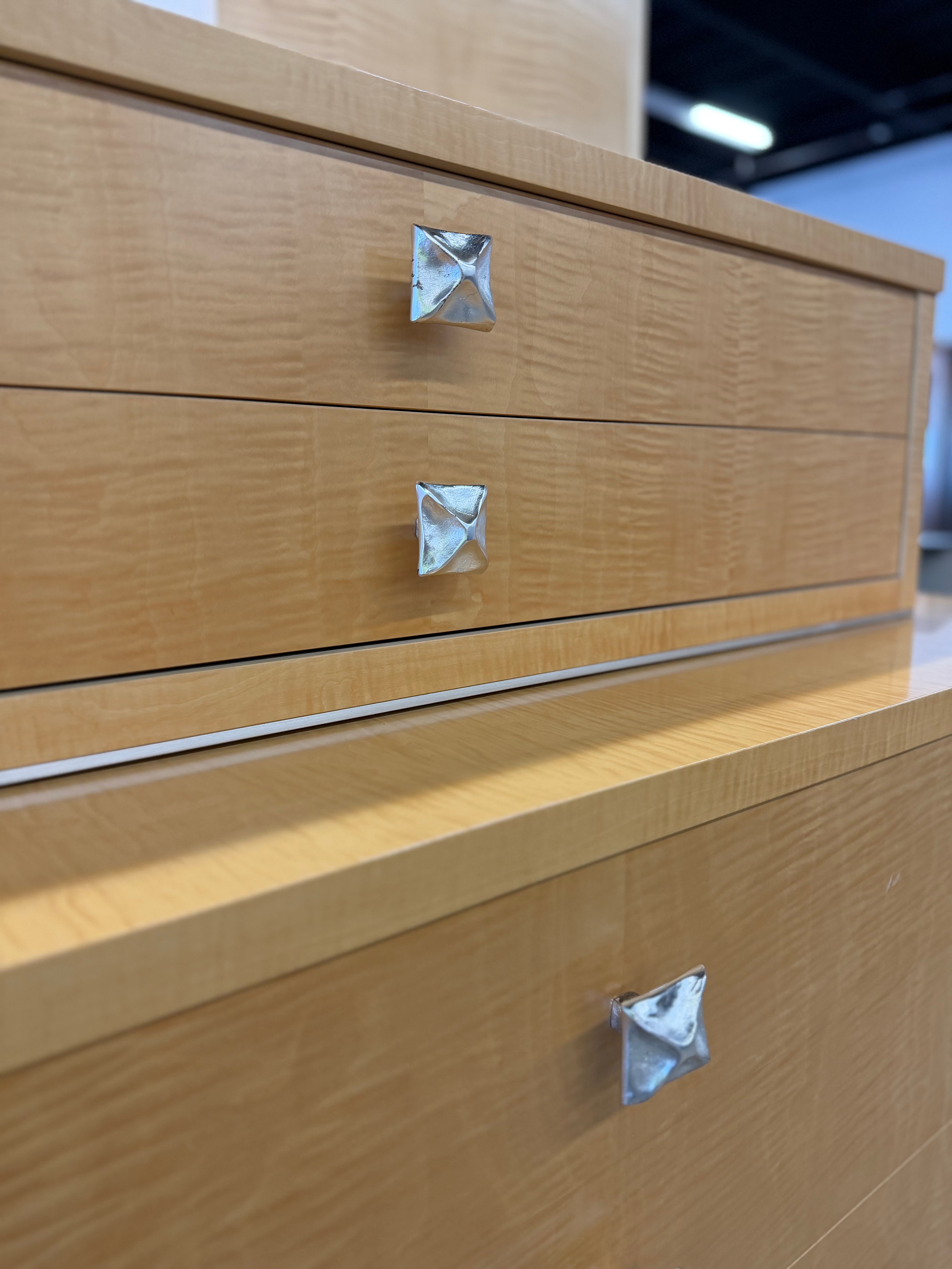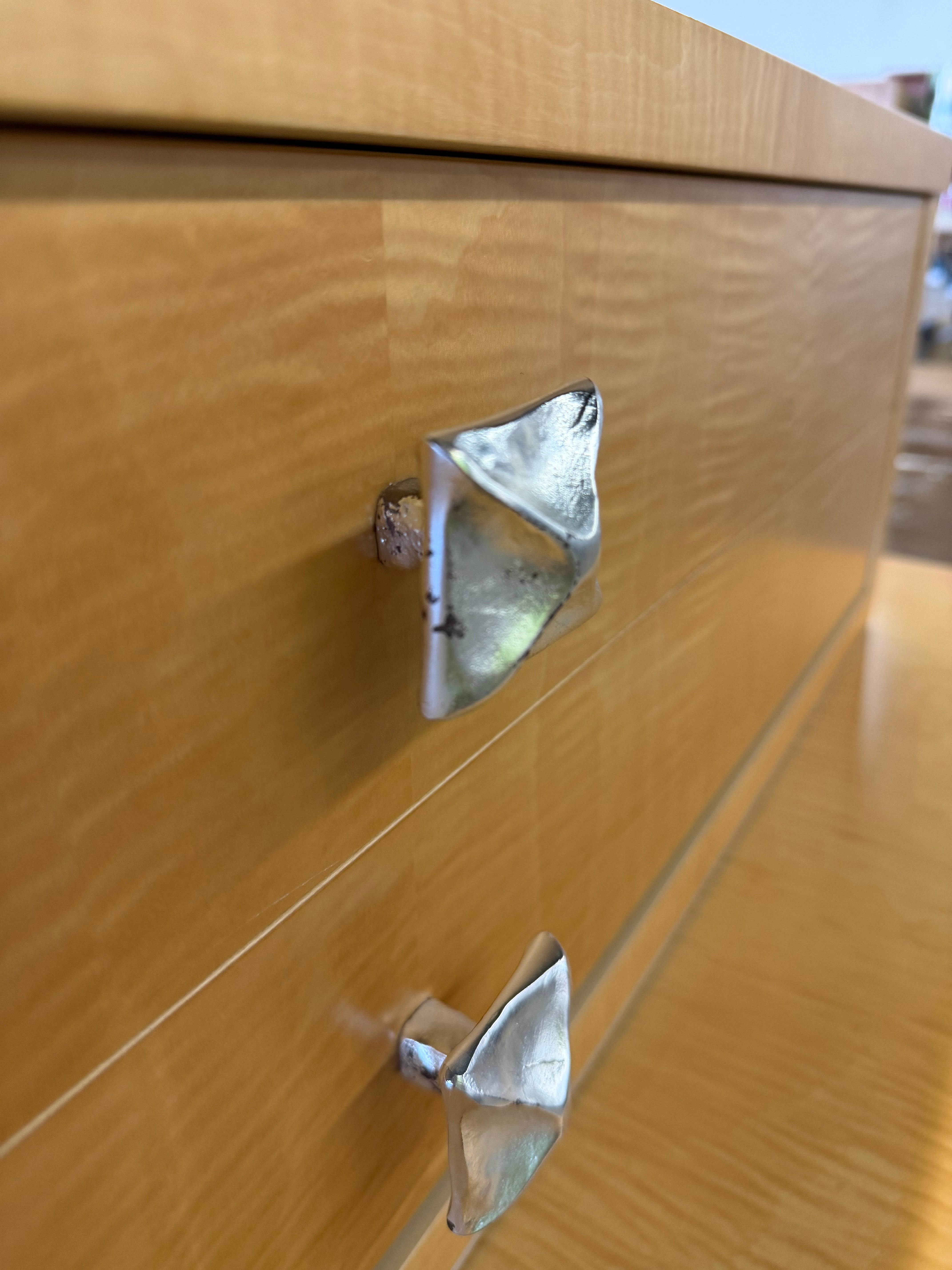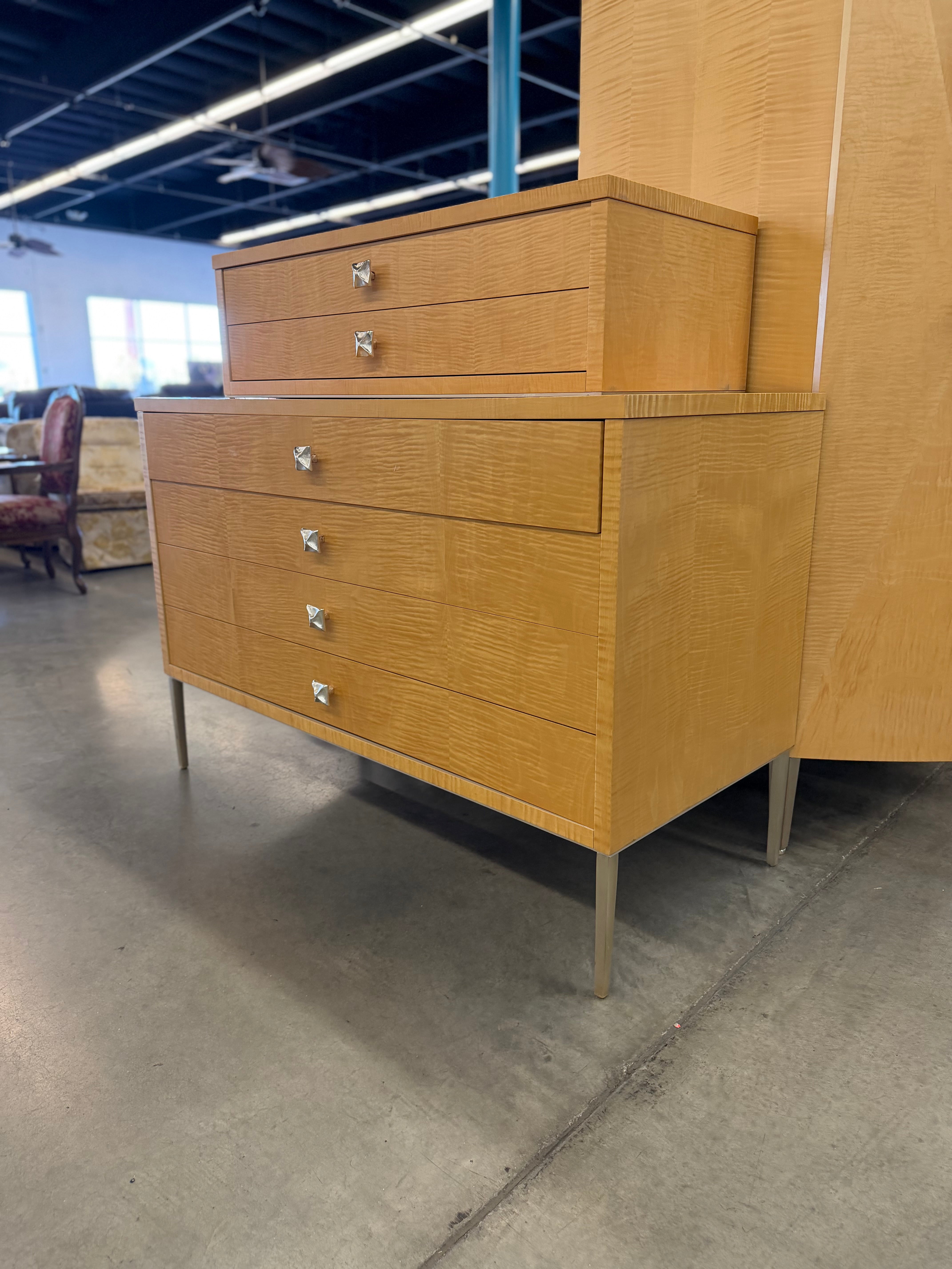 This stylish dresser features a light wood finish with a smooth, sleek texture. It has chrome accent knobs that add a contemporary touch. Approximate Size: 4 x 3 x 1.5