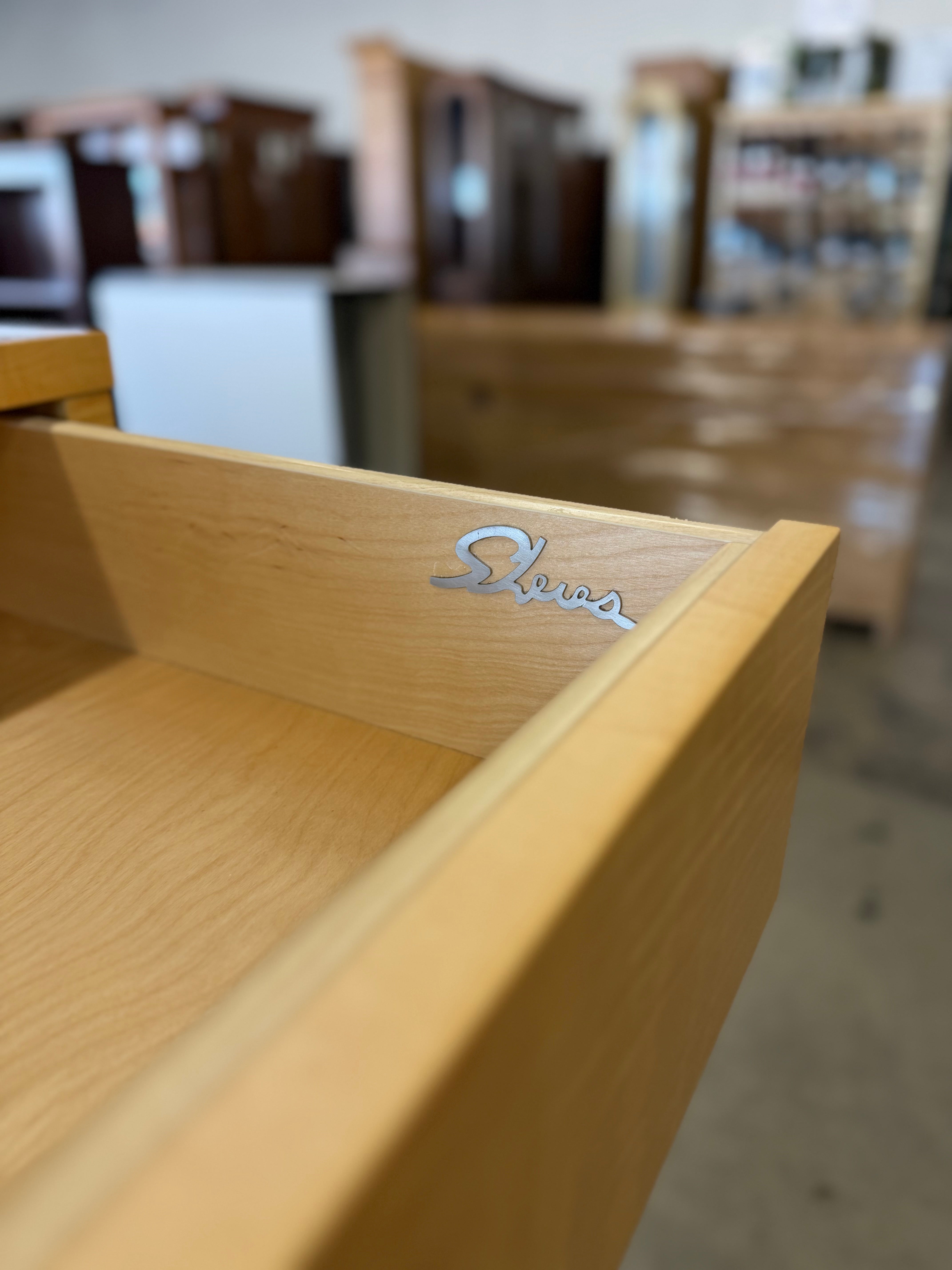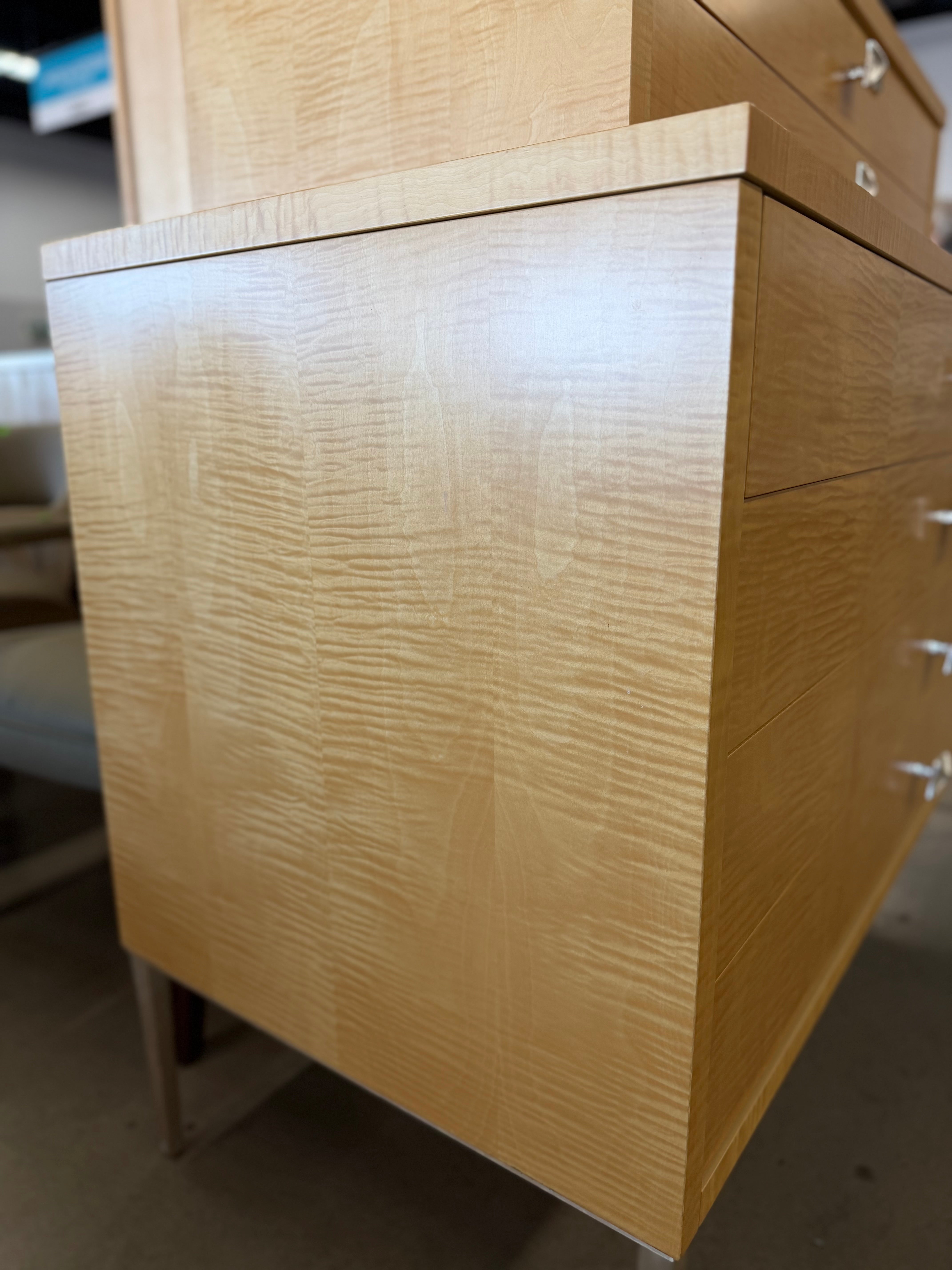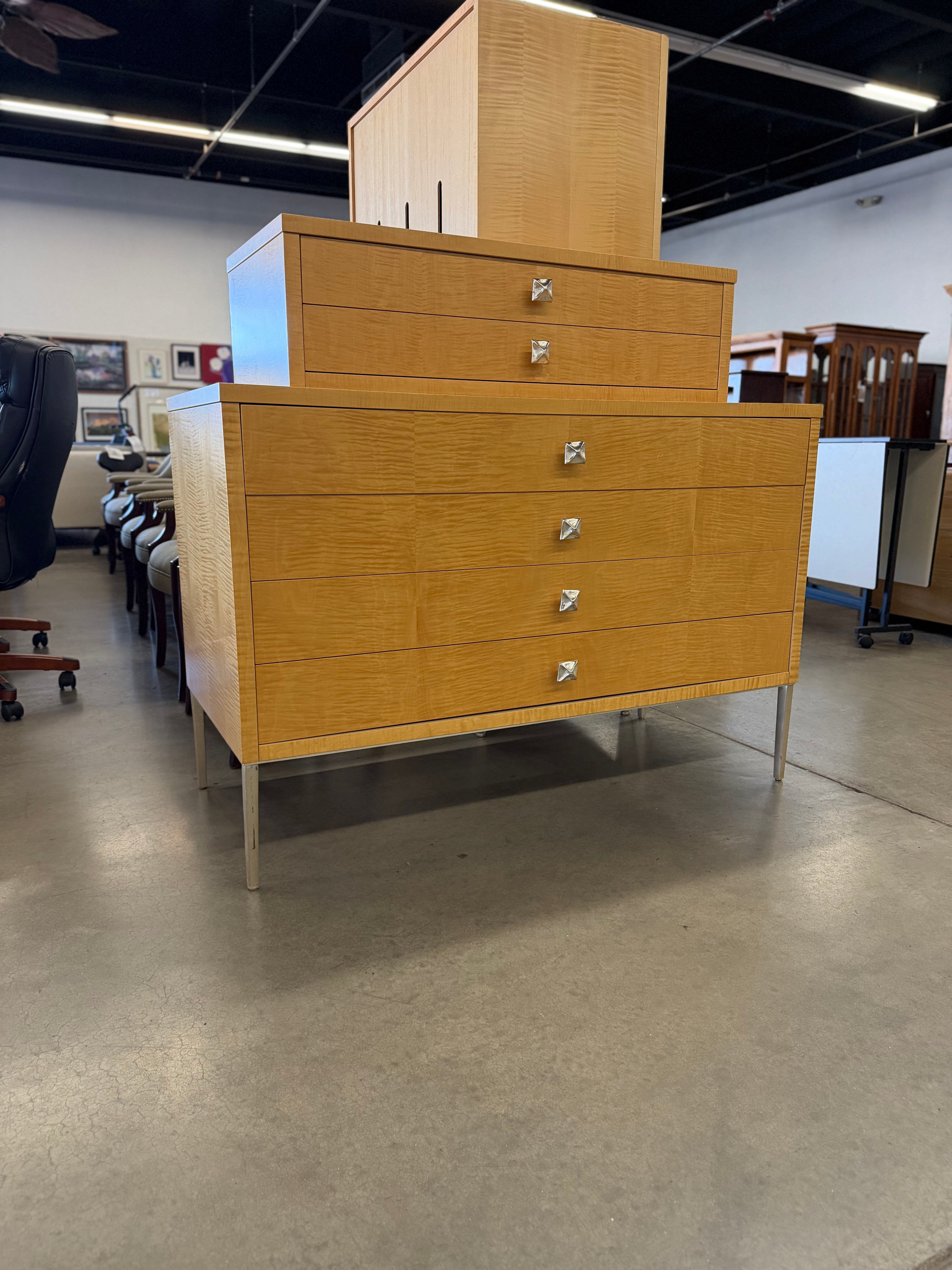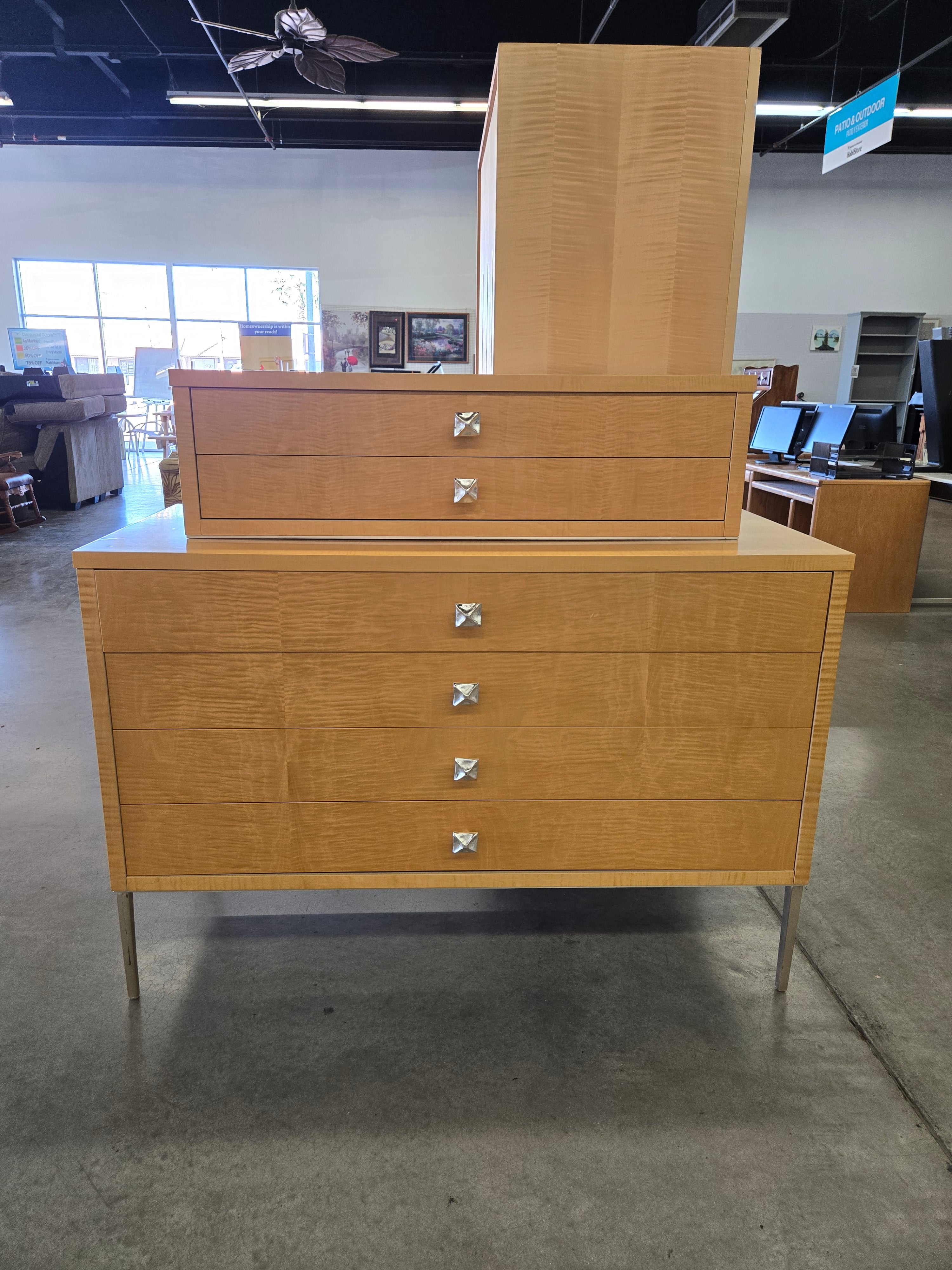 This stylish dresser features a light wood finish with a smooth, sleek texture. It has chrome accent knobs that add a contemporary touch. Approximate Size: 4 x 3 x 1.5