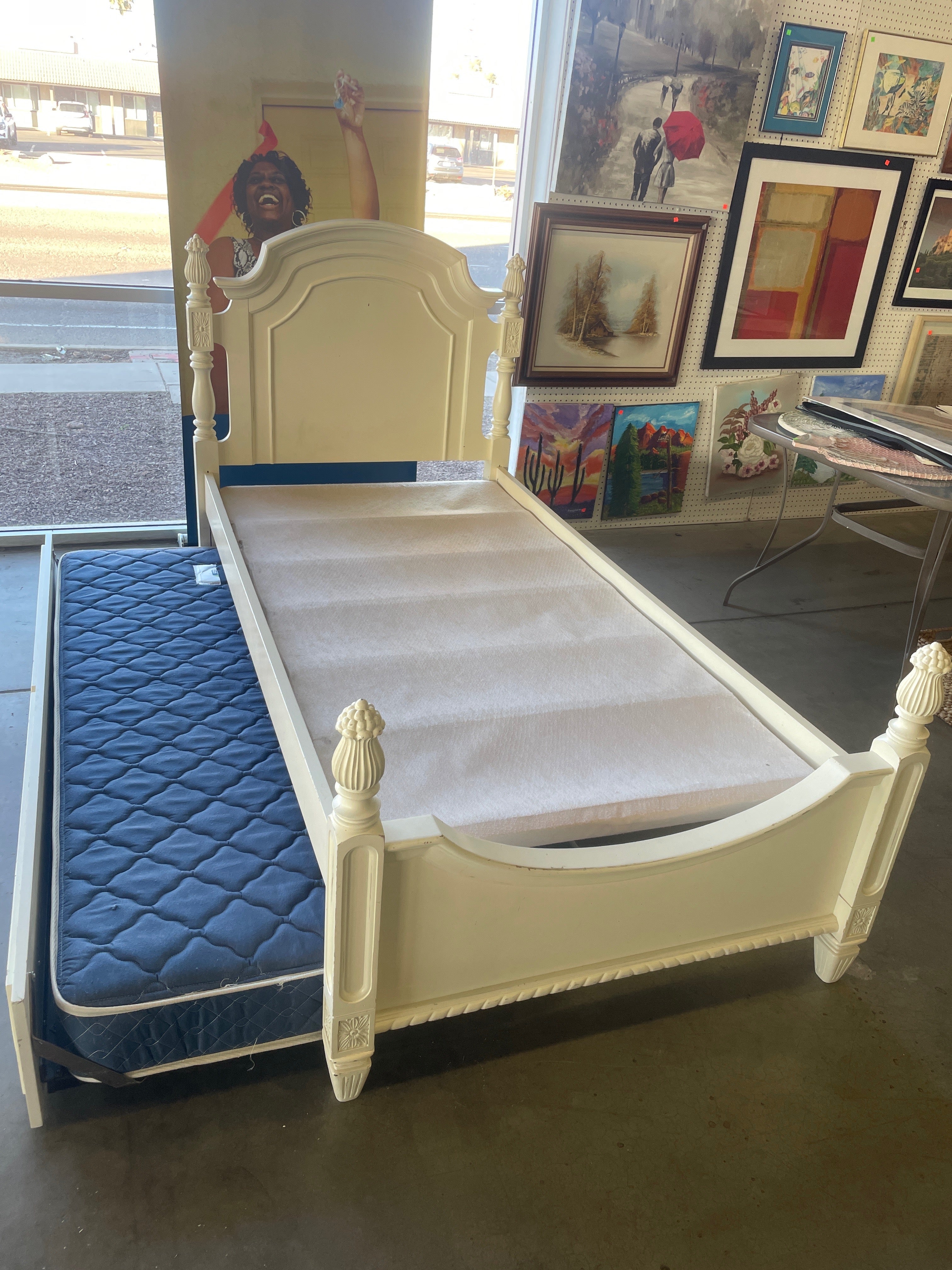 Antique-inspired twin bed frame with an elegant cream finish and intricately carved posts. Comes with a blue quilted fabric trundle bed, perfect for additional sleeping space. Approximate Size: 4 x 3.5 x 7