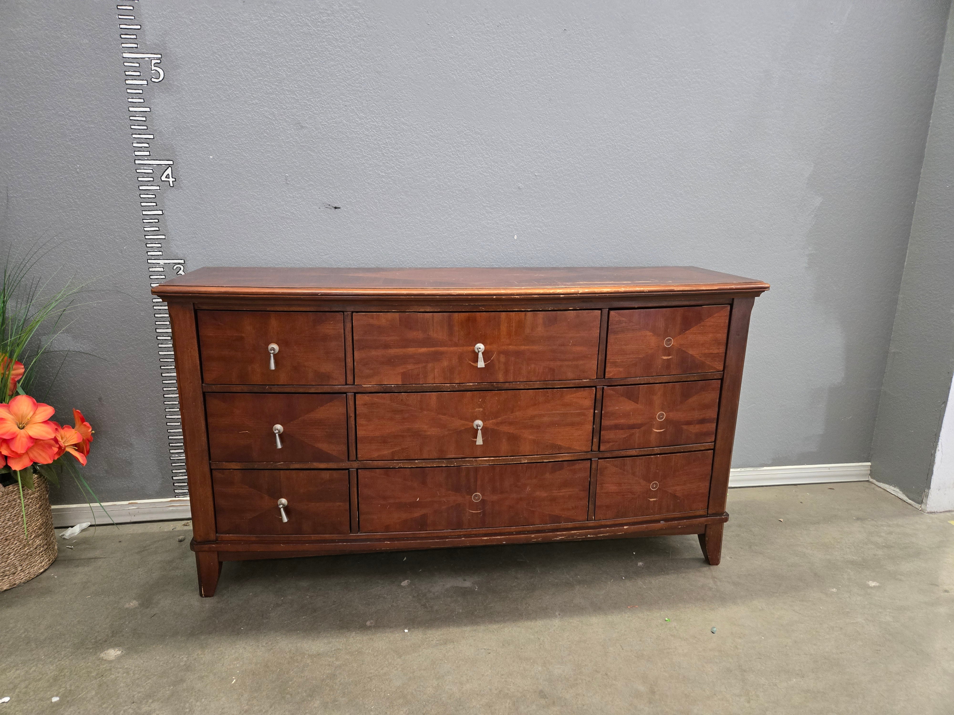 A classic vintage dresser featuring a rich brown finish and six spacious drawers. The dresser is crafted from sturdy wood with a smooth, polished look, adding a touch of elegance to any room. Approximate Size: 3 x 5 x 1.5