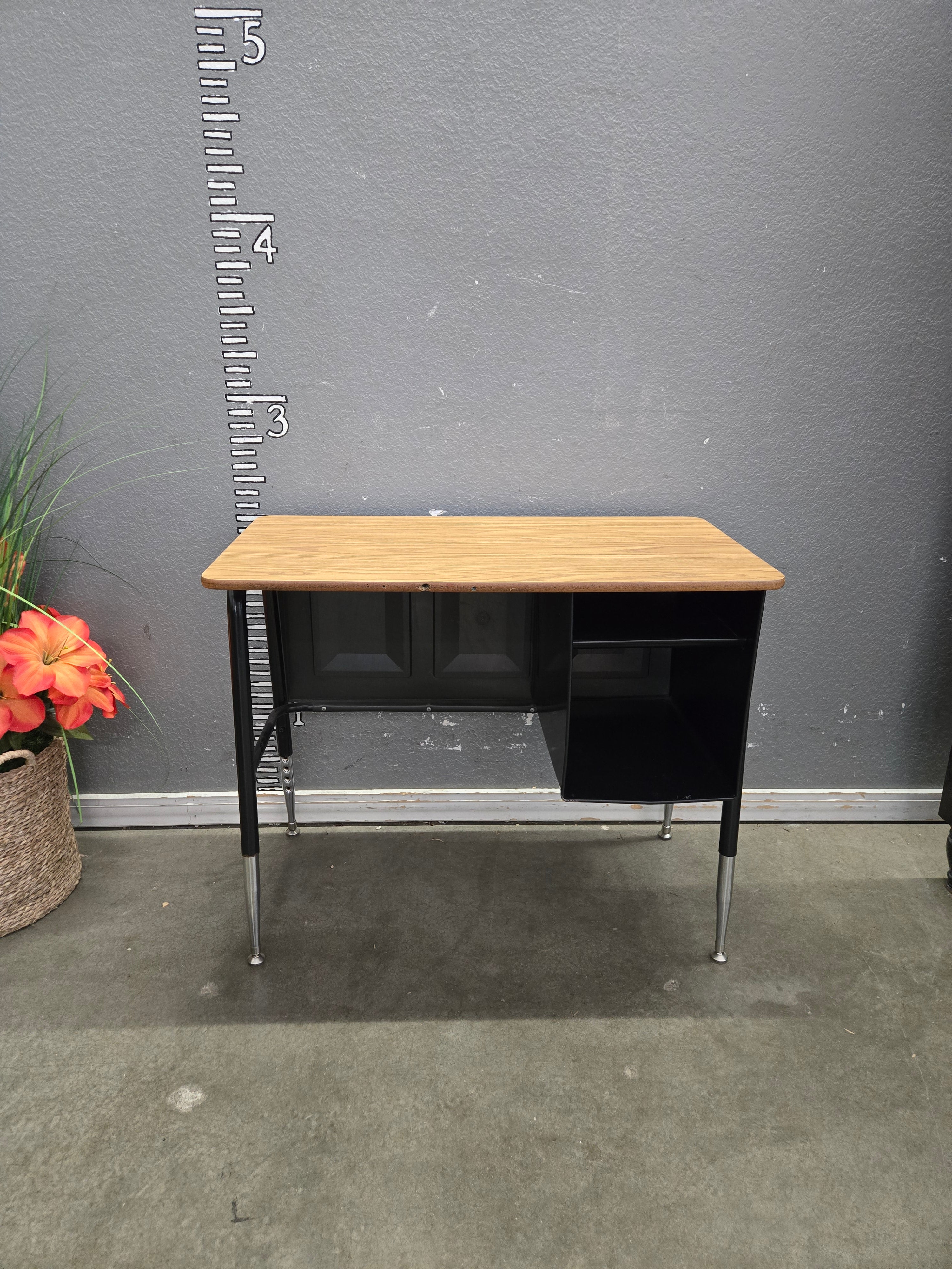 This sleek mid-century modern desk features a natural wood finish top paired with a black metal frame, creating a stylish and functional workspace. The desk includes a uniquely designed storage compartment for all your office essentials. Approximate Size: 3 x 4 x 2