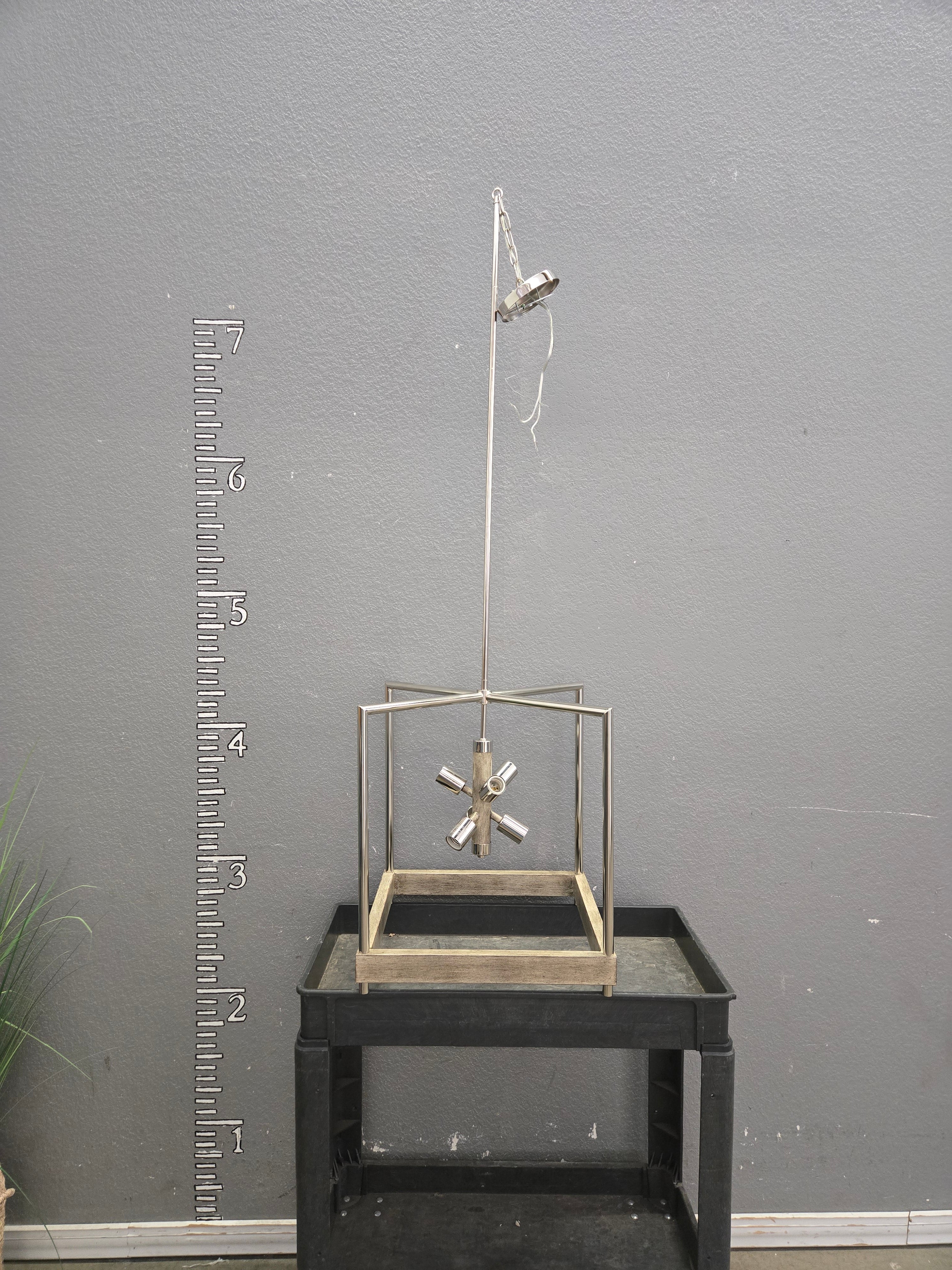 This modern industrial pendant light features a sleek metal frame with a brushed nickel finish. The open cage design houses five bulb sockets that provide ample illumination to any space. Ideal for adding a contemporary touch to your living environment. Approximate Size: 5 x 2 x 2