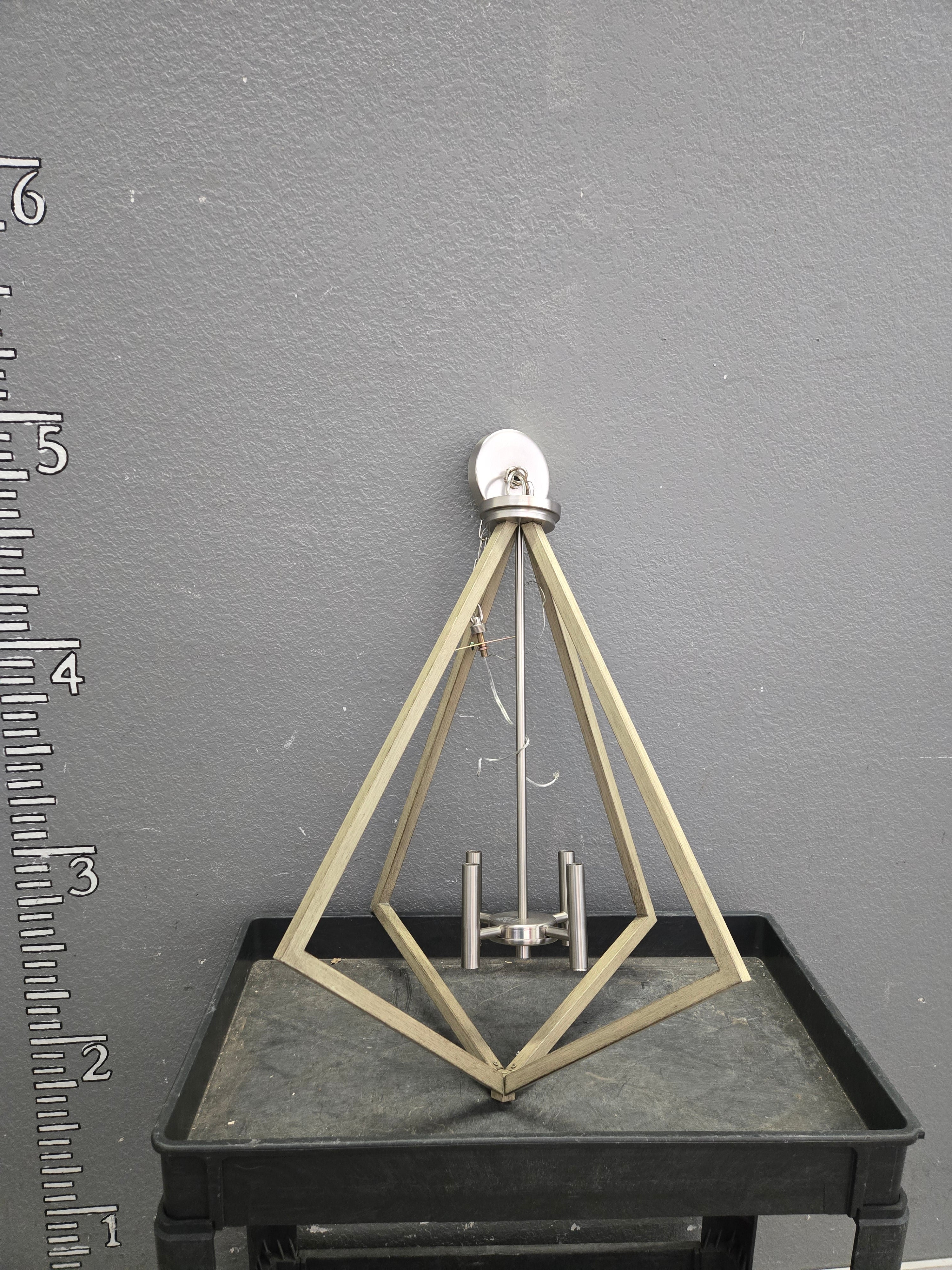 This modern, geometric hanging light fixture features a brushed silver finish. Its open-frame design adds an elegant touch to any room. Approximate Size: 2.5 x 1.5 x 1.5