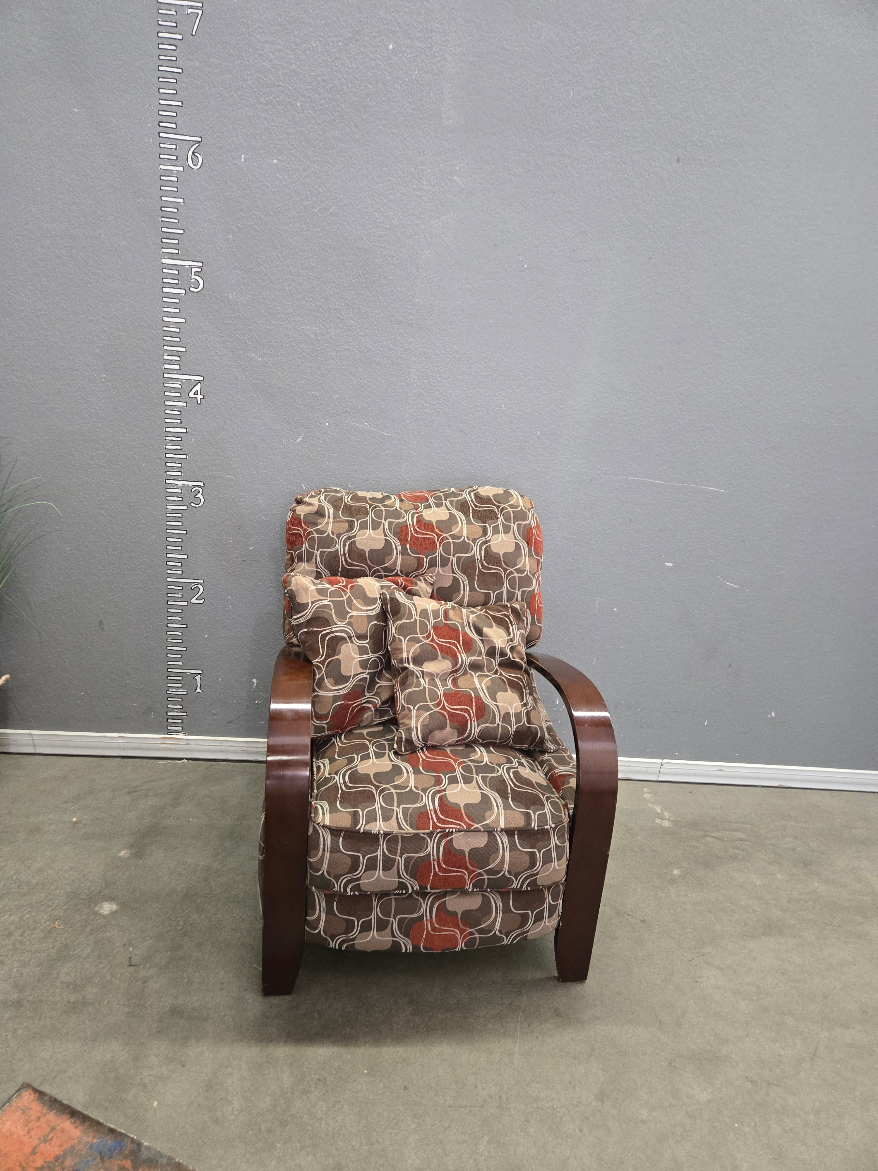 This stylish armchair features a retro geometric fabric design with brown, orange, and beige colors. Its wooden arms offer a polished finish, complementing the comfortable fabric upholstery. Includes matching decorative cushions. Approximate Size: 3 x 2.5 x 2.5