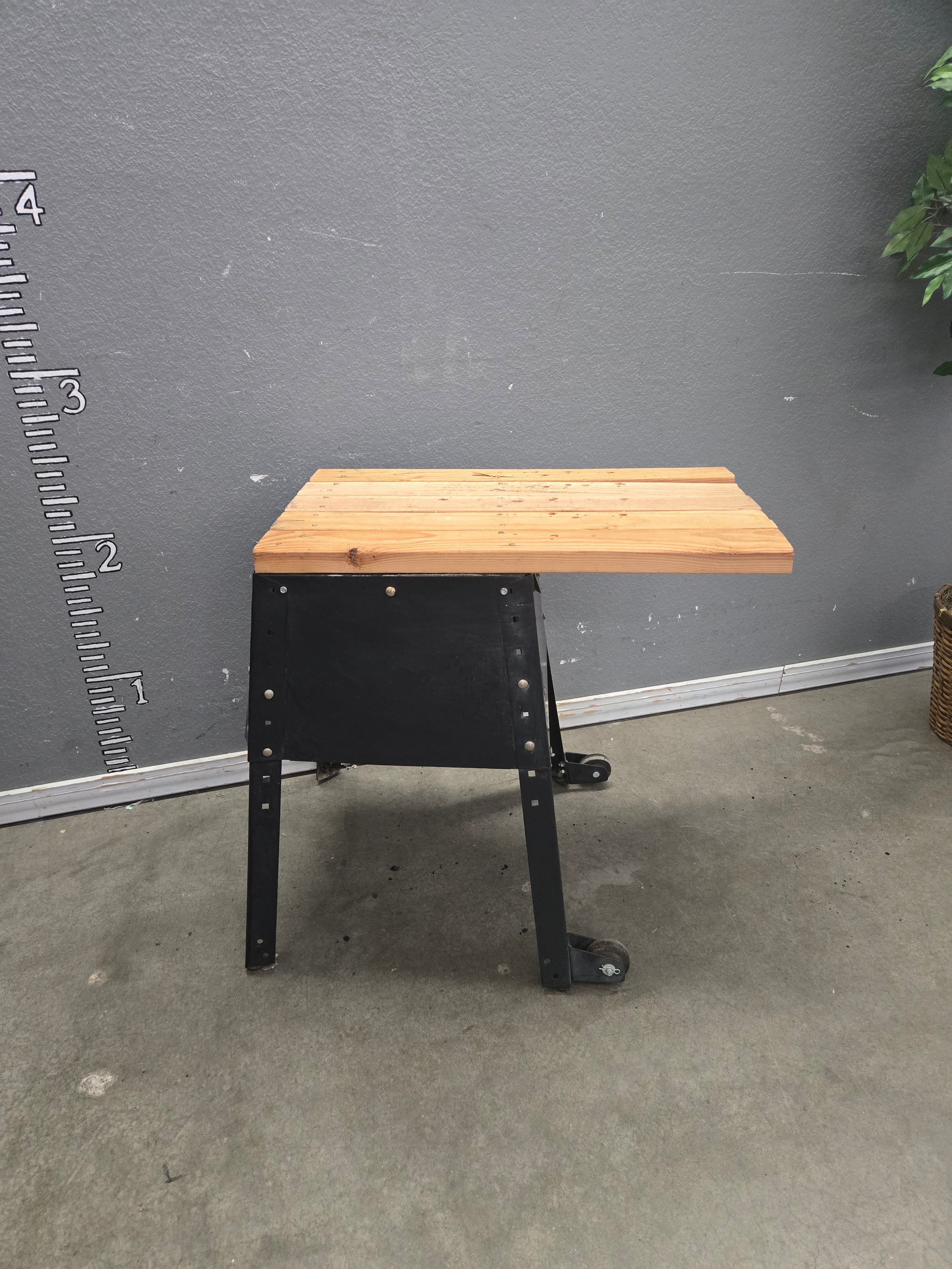 This industrial-style workbench features a natural wooden top with a smooth finish, supported by a sturdy black metal frame. The design includes wheels for easy mobility, making it a versatile addition to any workspace. Approximate Size: 3 x 2.5 x 2