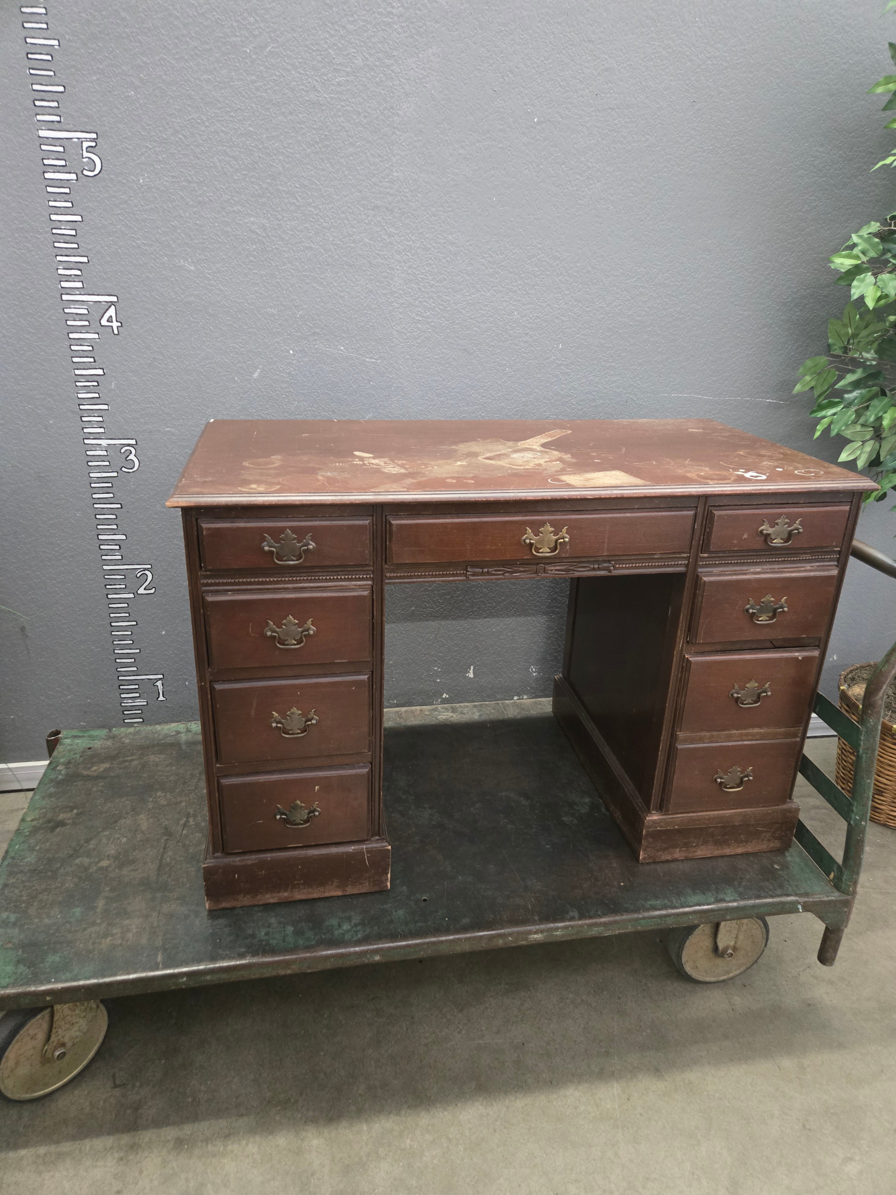 This vintage desk features a rich brown finish with a classic wood texture. The desk is equipped with multiple drawers providing ample storage space. Approximate Size: 3 x 4.5 x 2