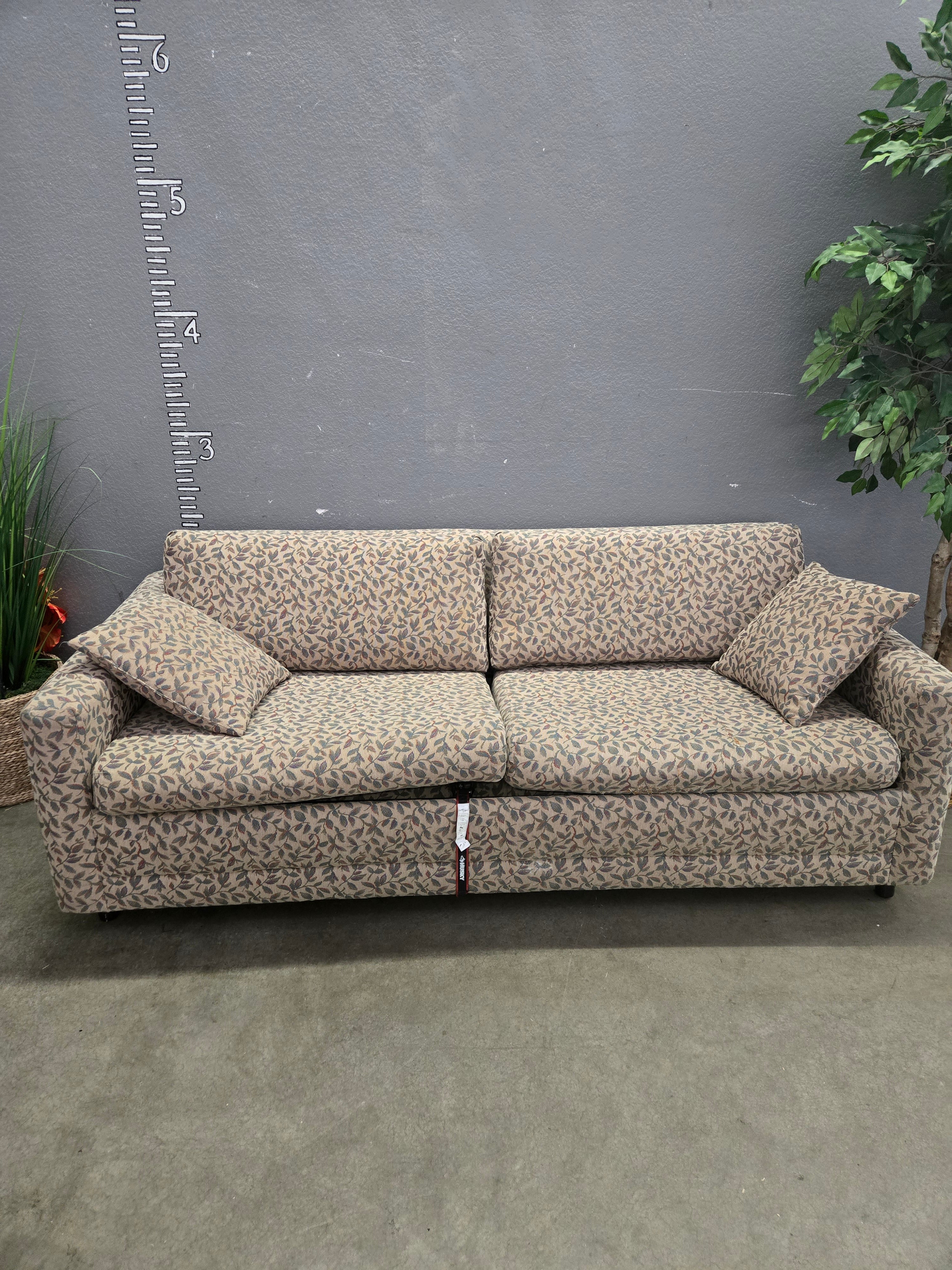 A comfortable and stylish sofa featuring a floral patterned fabric in neutral tones. The upholstery has a soft, smooth finish, perfect for a cozy living room setting. Approximate Size: 3 x 7 x 3