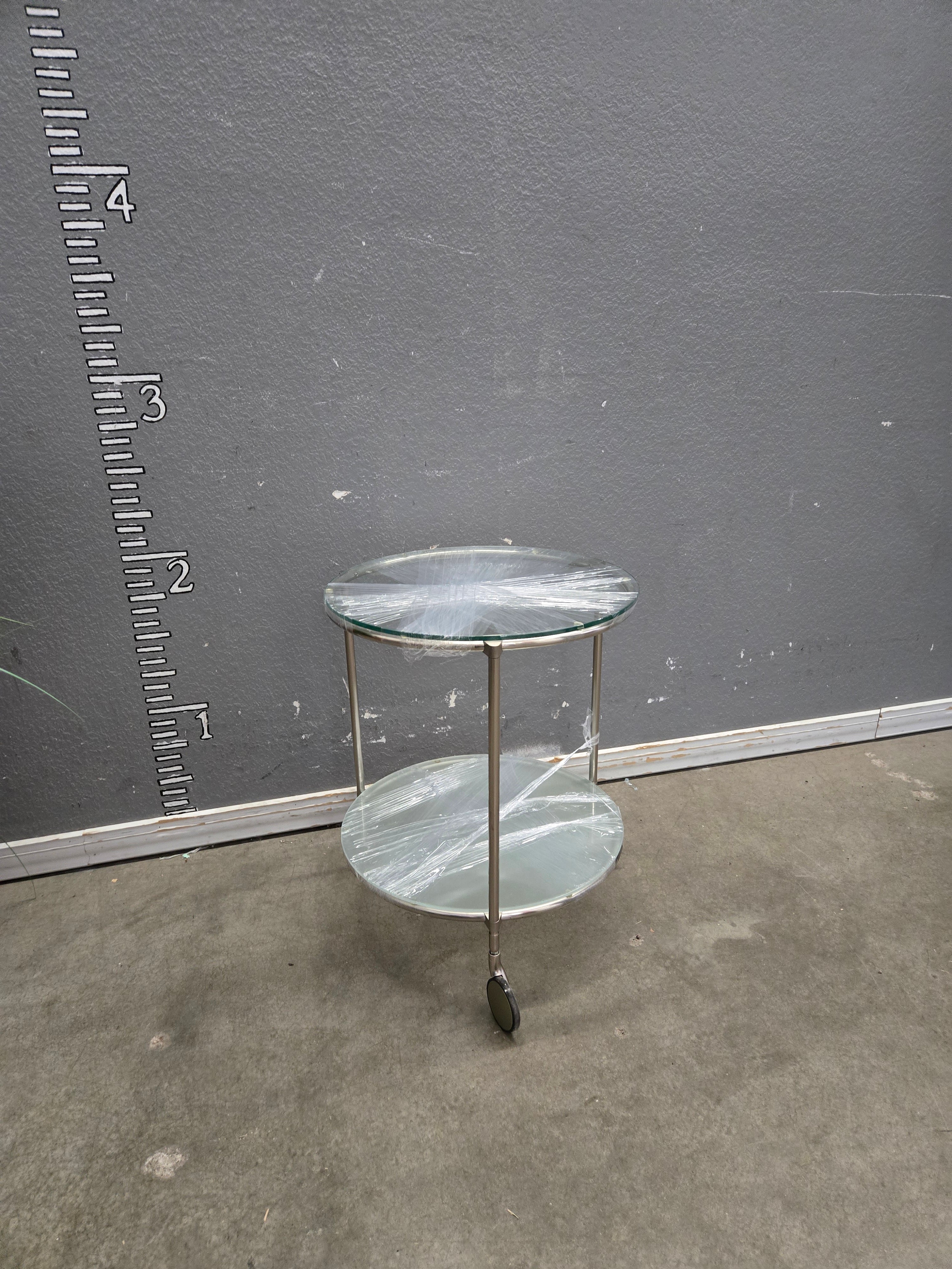 This elegant side table features a sleek metal frame with a shiny chrome finish and two tempered glass surfaces. The glass is clear and adds a modern touch to any room. Approximate Size: 2 x 1.5 x 1.5