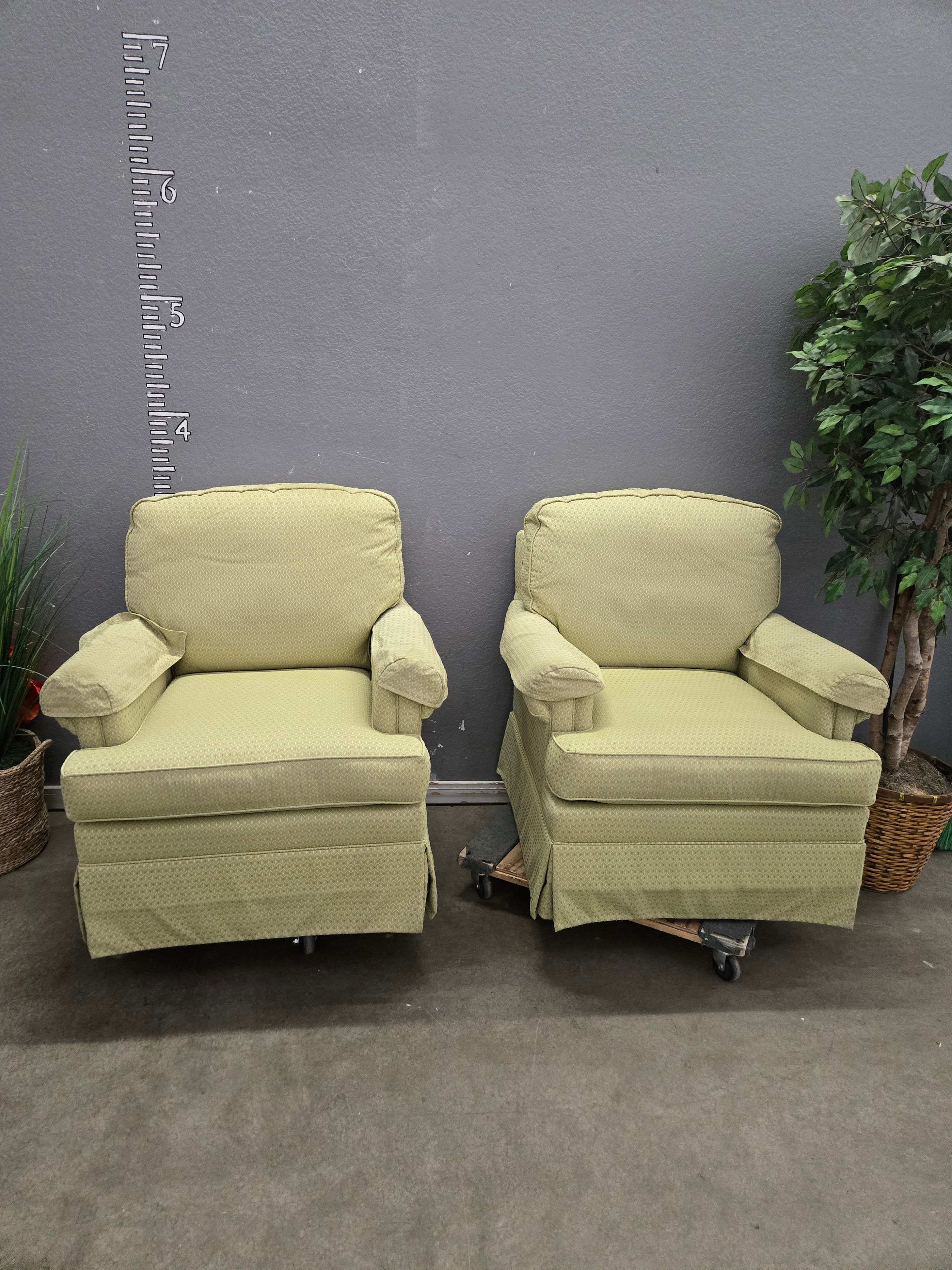 This set of vintage armchairs features a soft green fabric with a subtle texture, providing both comfort and style. The fabric has a matte finish, adding a touch of classic elegance to any room. Approximate Size: 3 x 2.5 x 2.5