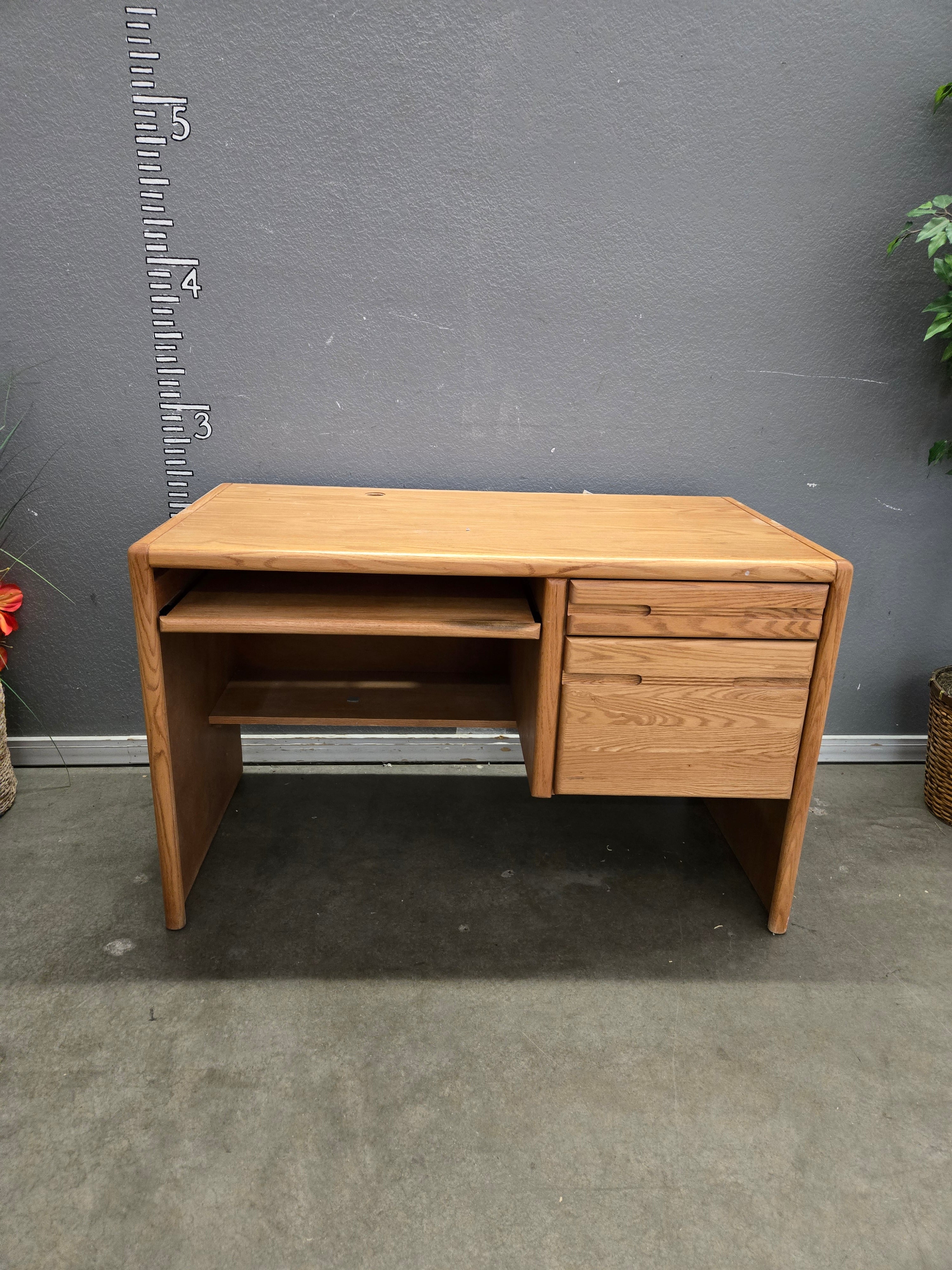 This vintage oak writing desk features a natural wood finish that highlights its classic grain patterns. Designed with functionality in mind, it includes a slide-out keyboard tray and two storage drawers for organizing office supplies. Approximate Size: 2.5 x 4 x 2