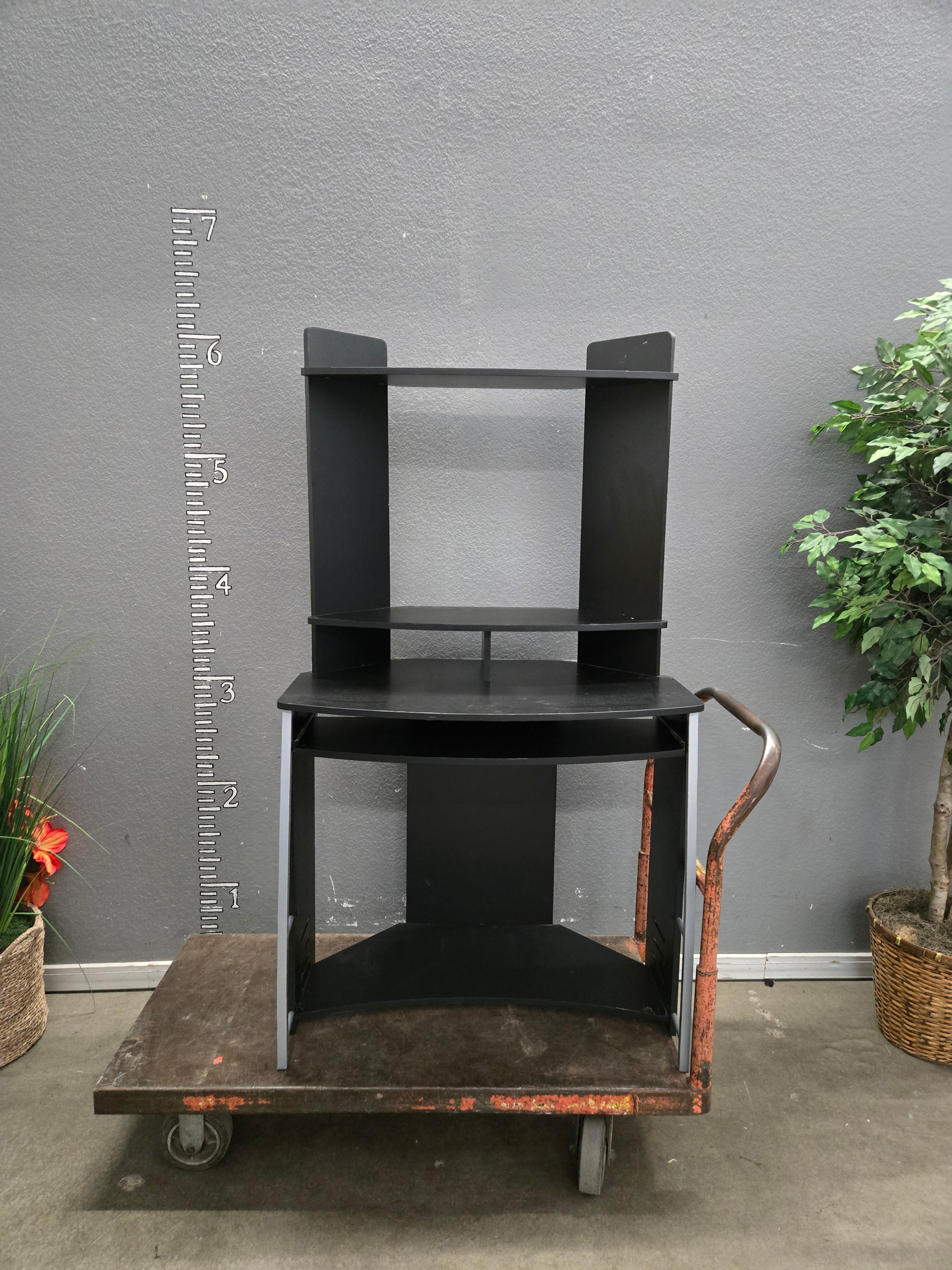 This sleek and modern computer desk features a matte black finish, ideal for maximizing space in any office setting. Its contemporary design provides a perfect corner solution for your computer and office essentials. Approximate Size: 4.5 x 2 x 2