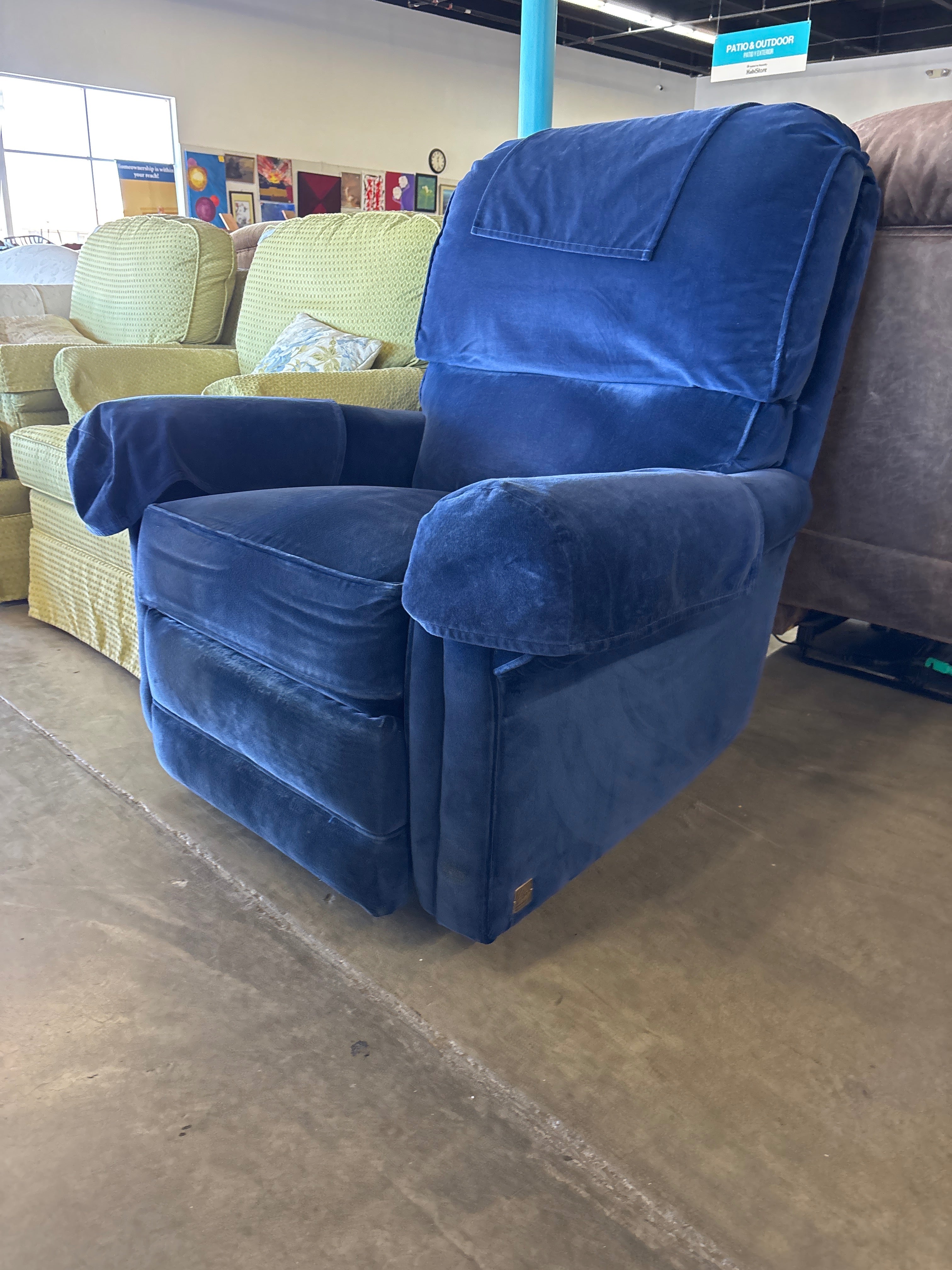 This plush recliner features a rich navy blue velvet fabric with a smooth, velvety finish. Perfect for adding a touch of elegance and comfort to any living space. Approximate Size: 3.5 x 3 x 3