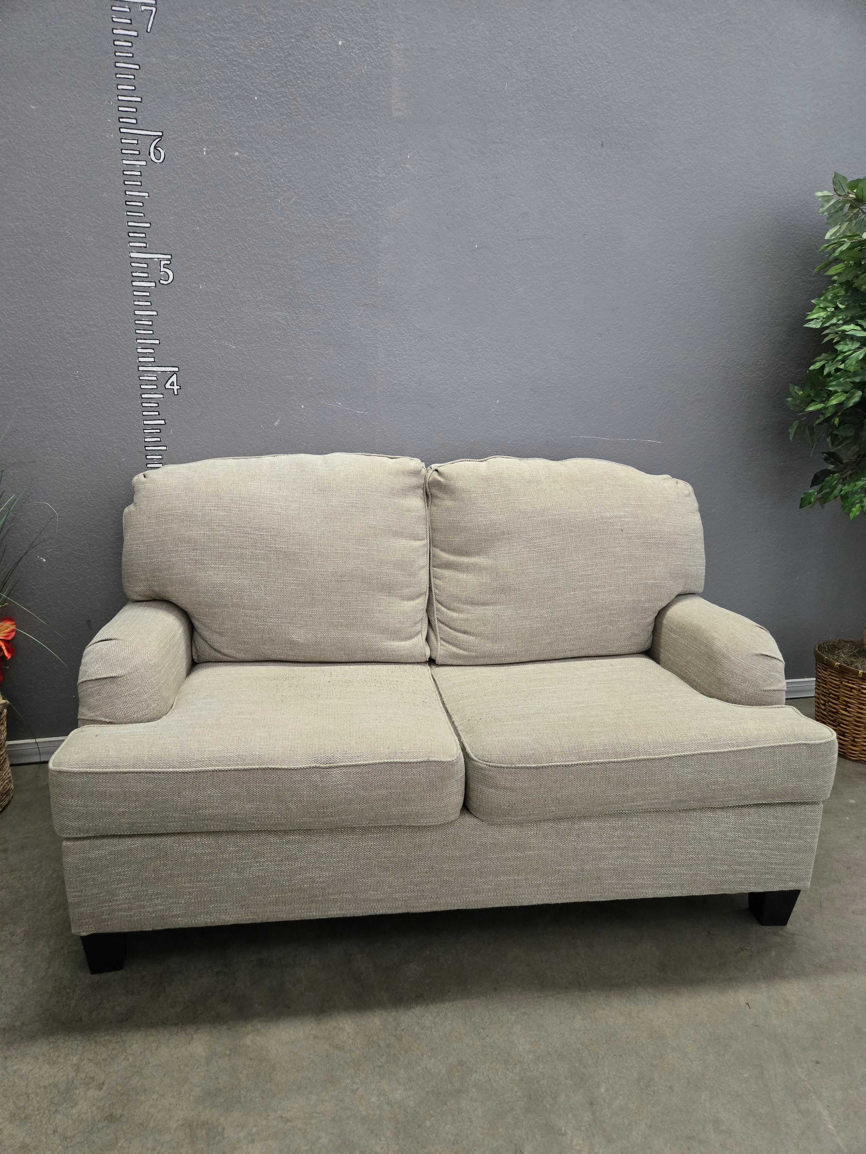 This contemporary loveseat features a light beige fabric with a smooth, woven finish, perfect for any living room setting. The neutral color and clean lines provide a timeless look that complements a variety of interior styles. Approximate Size: 3 x 5 x 3
