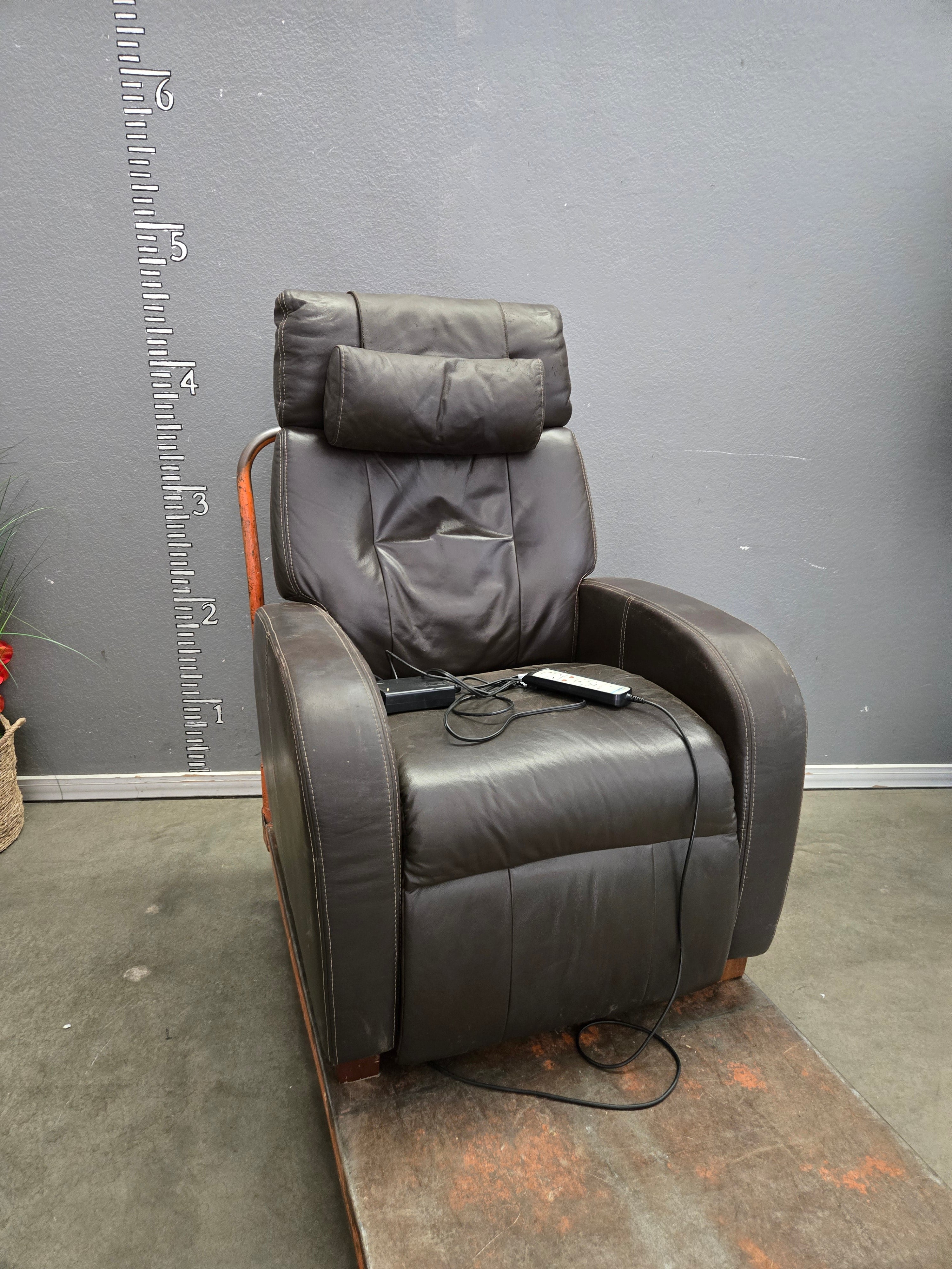 Experience ultimate relaxation with this reclining chair featuring a smooth, dark brown leather finish. It's equipped with a massage function for added comfort. Approximate Size: 4 x 3 x 3