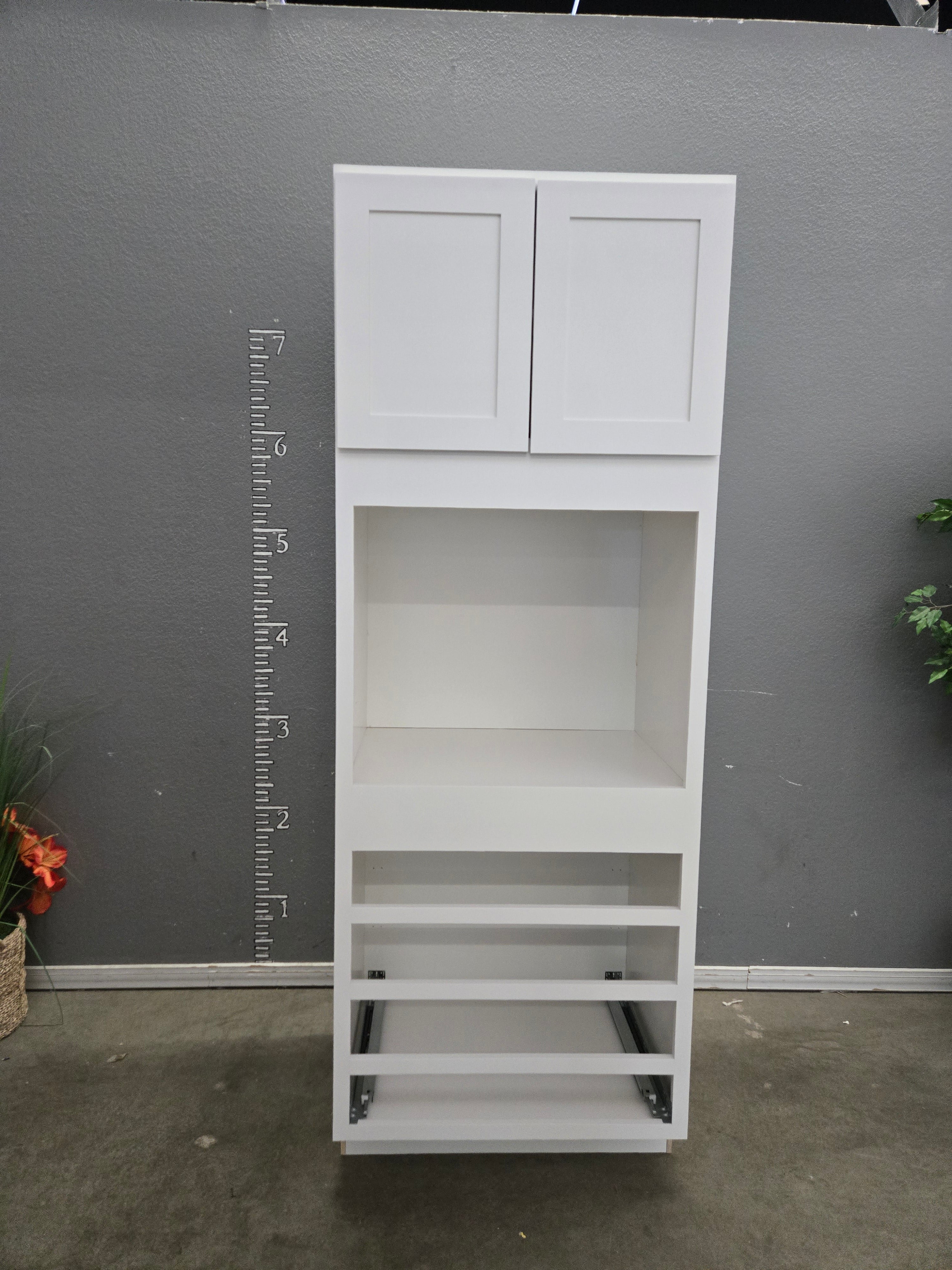 This pristine white kitchen pantry cabinet features a contemporary shaker-style finish. Designed with two upper doors and spacious shelving below, this cabinet provides ample storage for your kitchen essentials. Approximate Size: 7 x 2.5 x 1.5