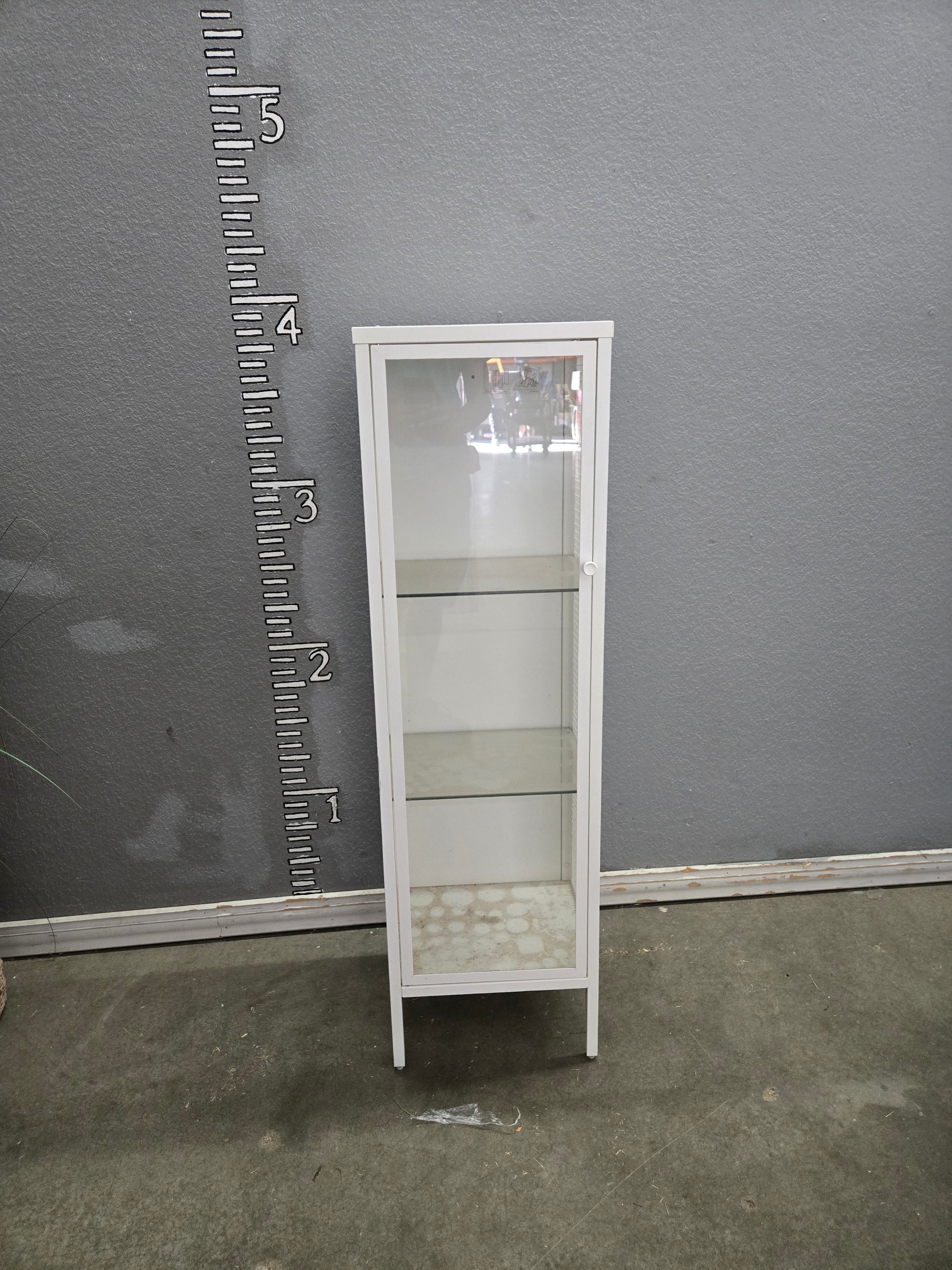This sleek white metal display cabinet features three glass shelves, perfect for showcasing your favorite items. The cabinet has a clean, modern design with a glossy finish that fits any decor. Approximate Size: 5 x 1.5 x 1.2