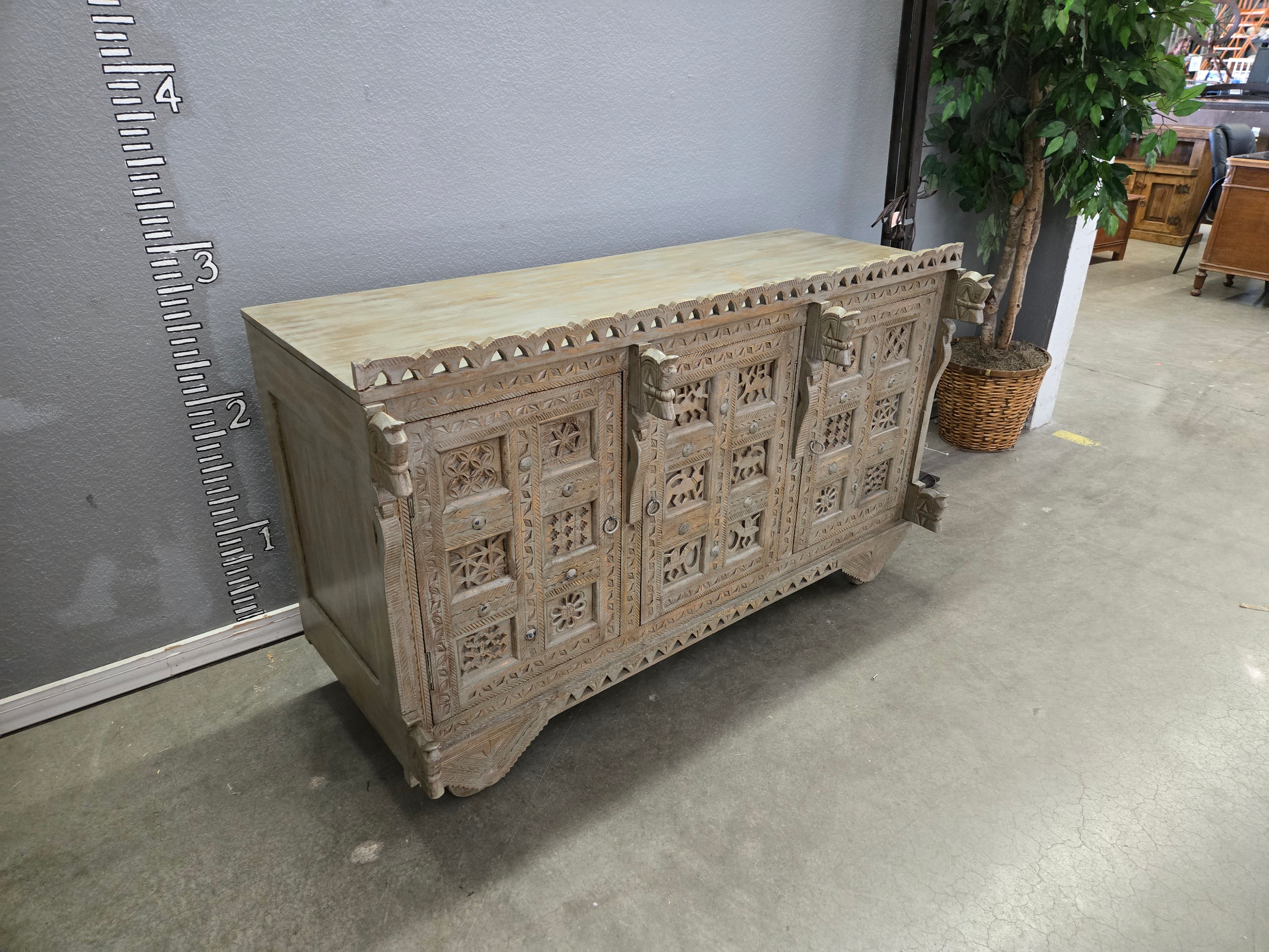 This beautiful cabinet features an intricate carved design with a rustic finish in light brown. The wooden craftsmanship offers a vintage and artisanal feel. Approximate Size: 3 x 4 x 1.5