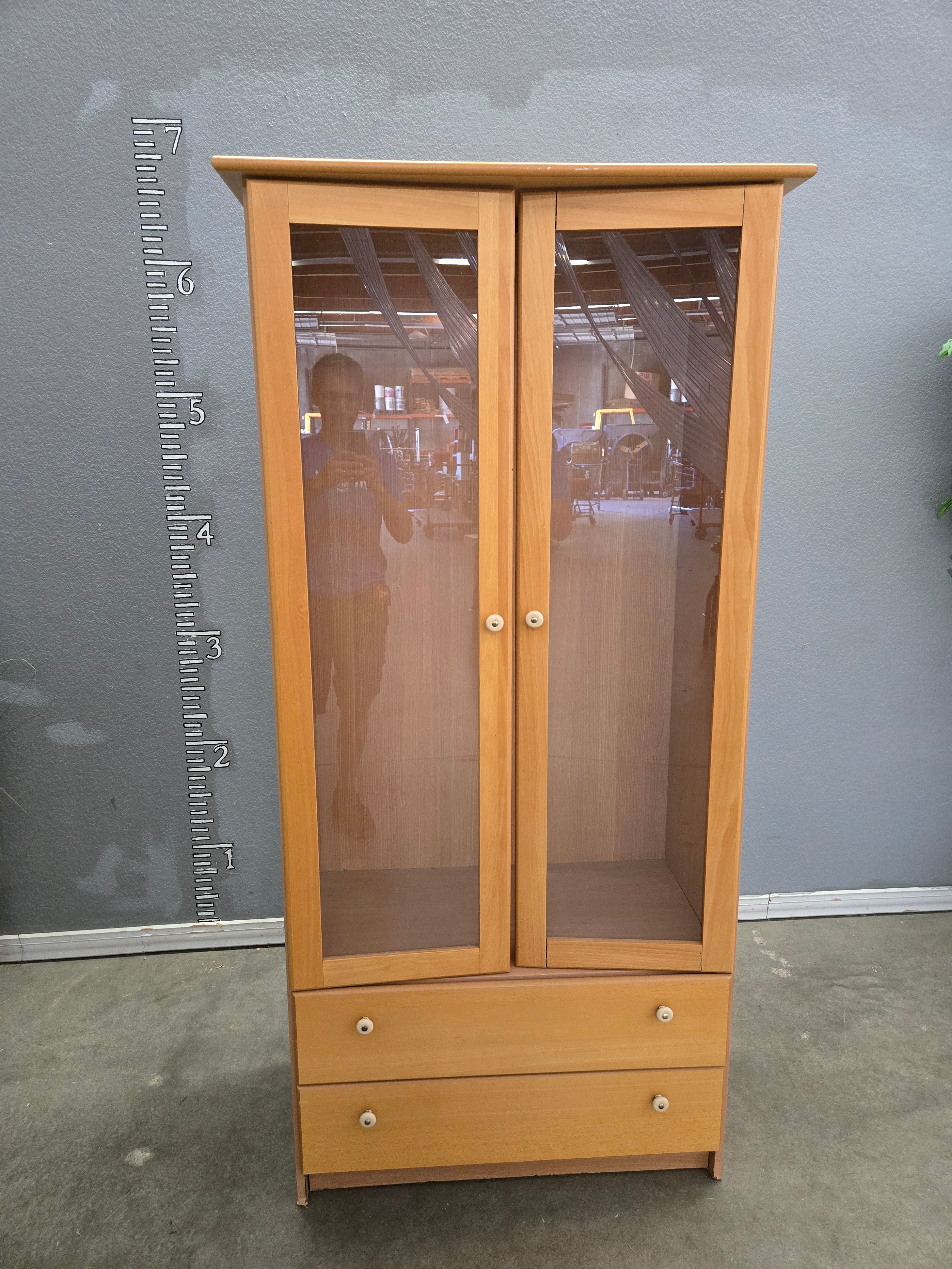 This elegant wooden display cabinet features a light oak color with a smooth, polished finish. It includes two glass doors and two drawers, perfect for any living room or office space. Approximate Size: 6.5 x 3 x 1.5