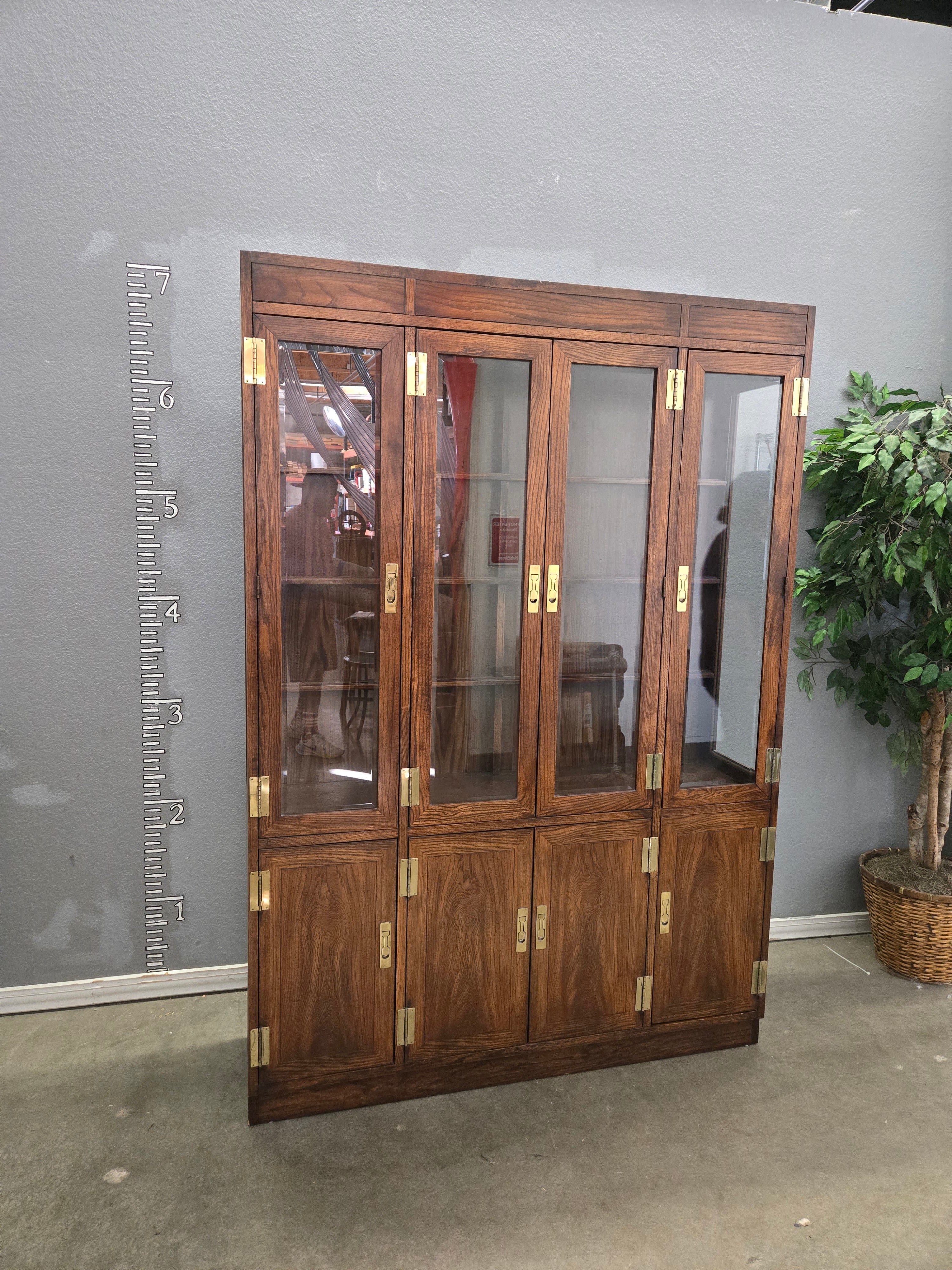This elegant display cabinet features a rich, warm brown wood finish and clear glass-paneled doors. The classic design includes brass hinges and handles, making it a stylish addition to any room. Ideal for showcasing fine china, collectibles, or books. Approximate Size: 7 x 5 x 1.5