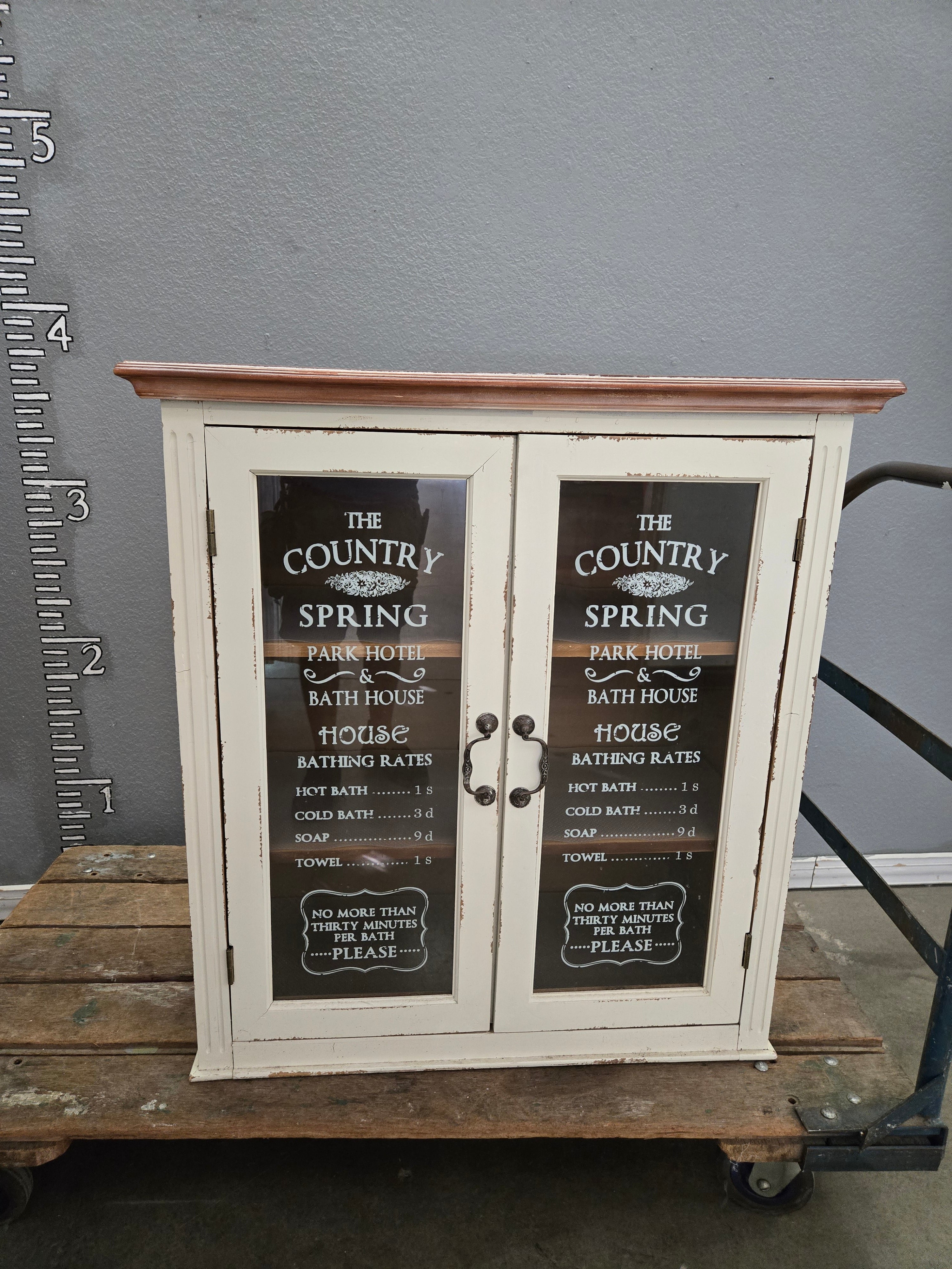 This charming cabinet features a distressed cream finish with decorative lettering on the glass doors, adding a touch of rustic elegance to any room. Approximate Size: 3 x 2 x 1