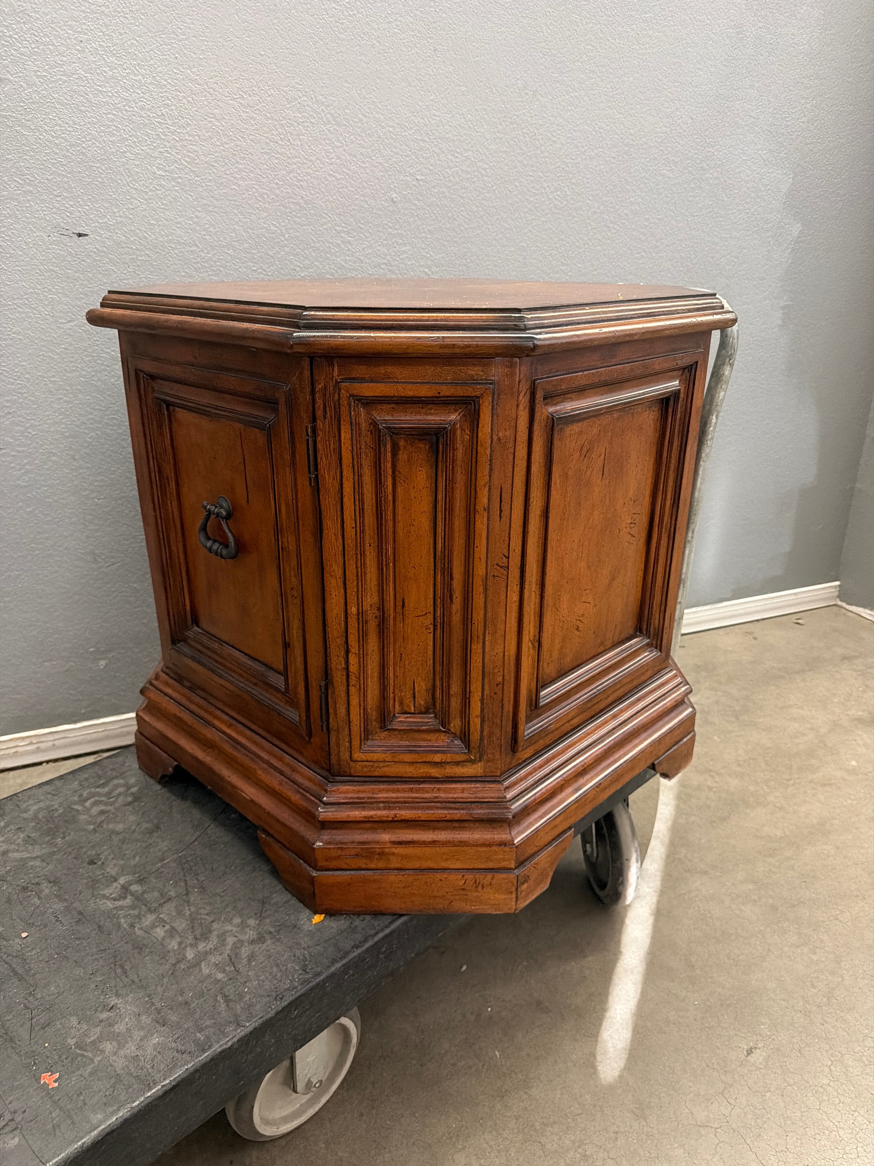This vintage cabinet features an elegant octagonal design with a rich, warm brown wood finish. The craftsmanship showcases detailed paneling and a sturdy metal handle, perfect for adding a touch of classic style to any room. Approximate Size: 2.5 x 2 x 2